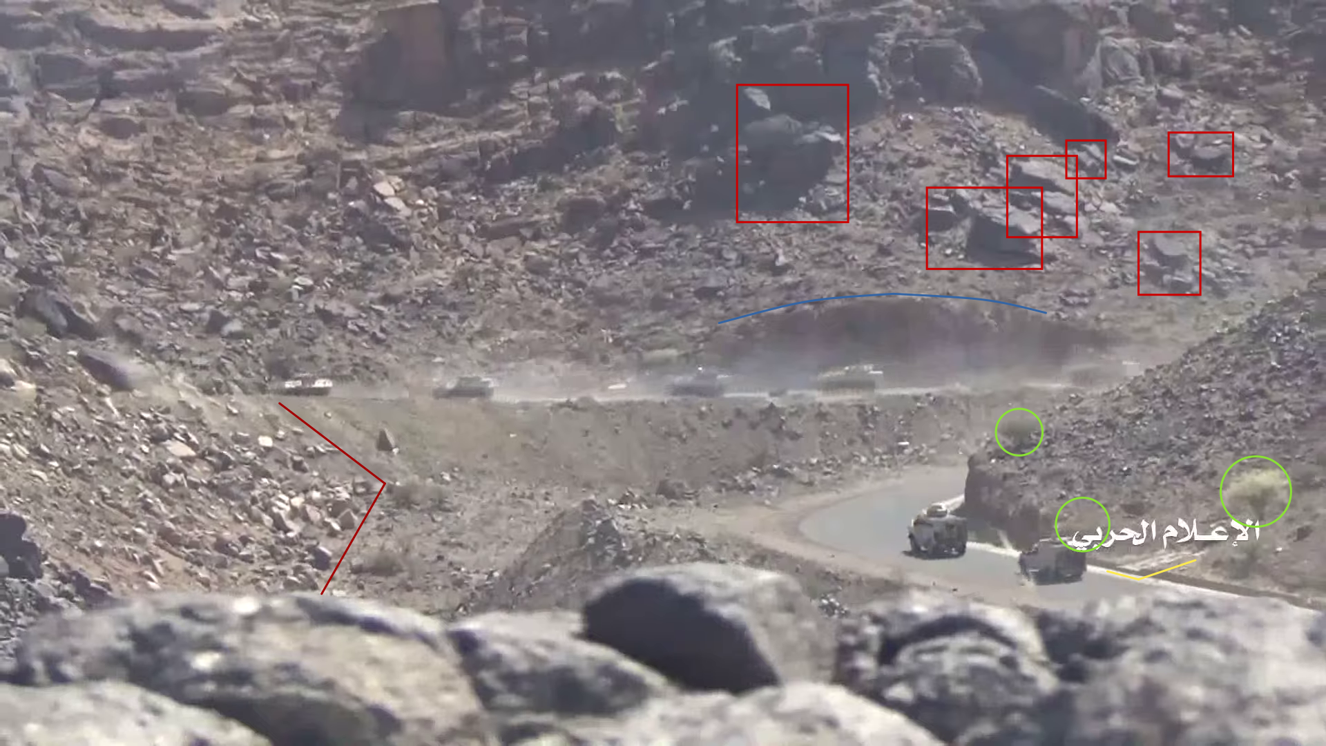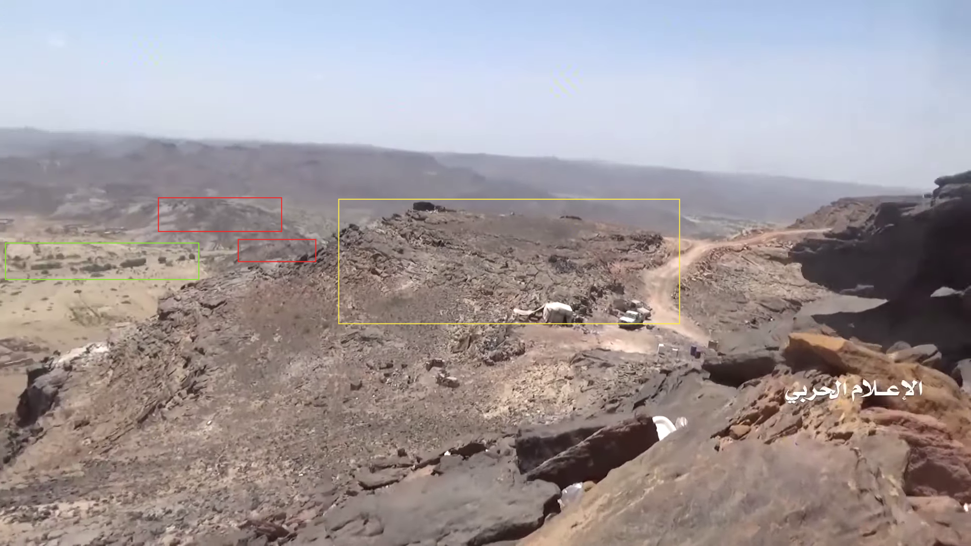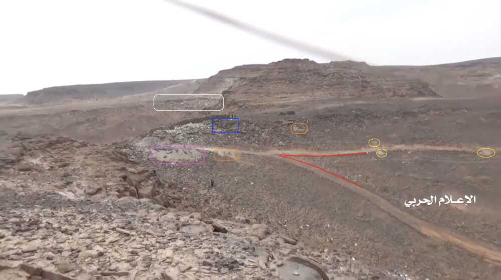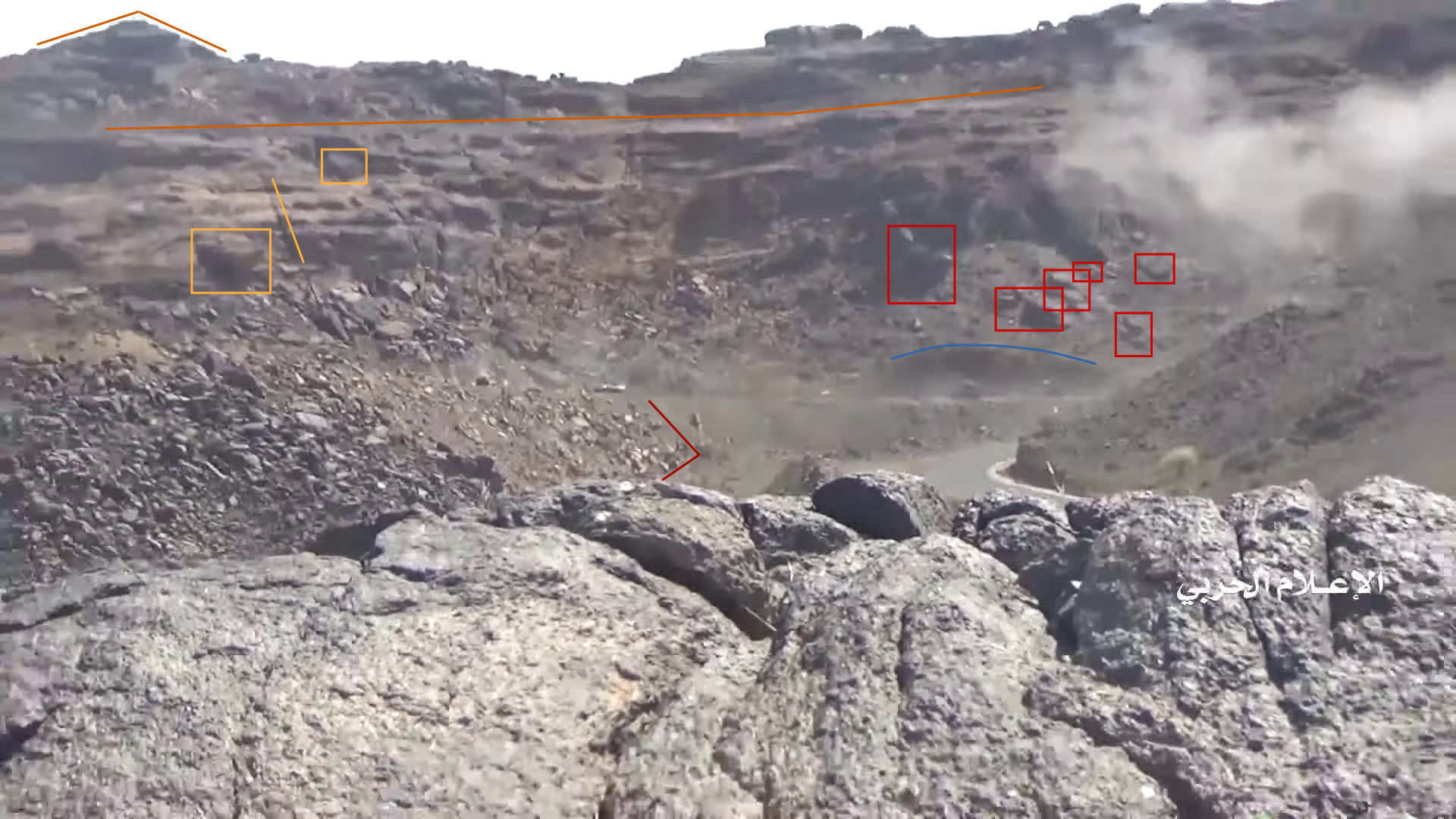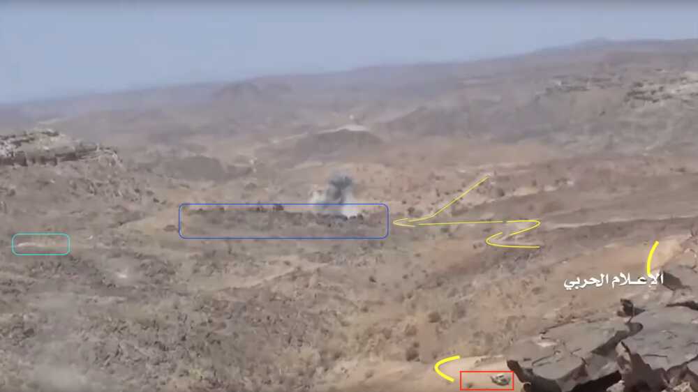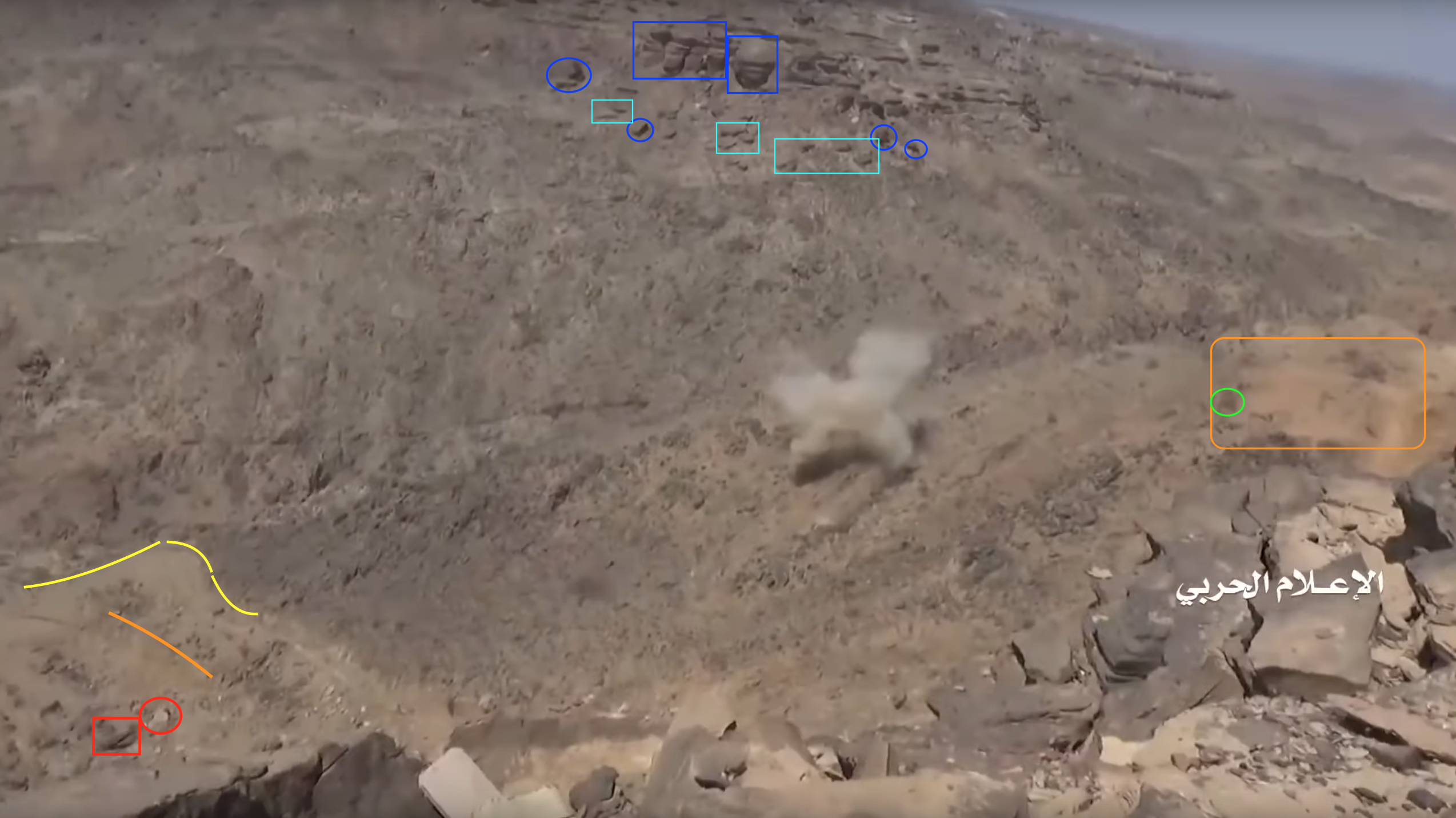 At 24:23 the Yemeni cameraman turns southwest to record the explosion of – likely – an artillery shot. This allows to identify several elements in the adjecent canyon; from left to right: squared and round rocks (red), linear ground shape (orange line), pointy road (yellow), opposite cliff's rocks (blue), smaller rocks (light blue), a tree (green) next to a flat dusty area (orange square).