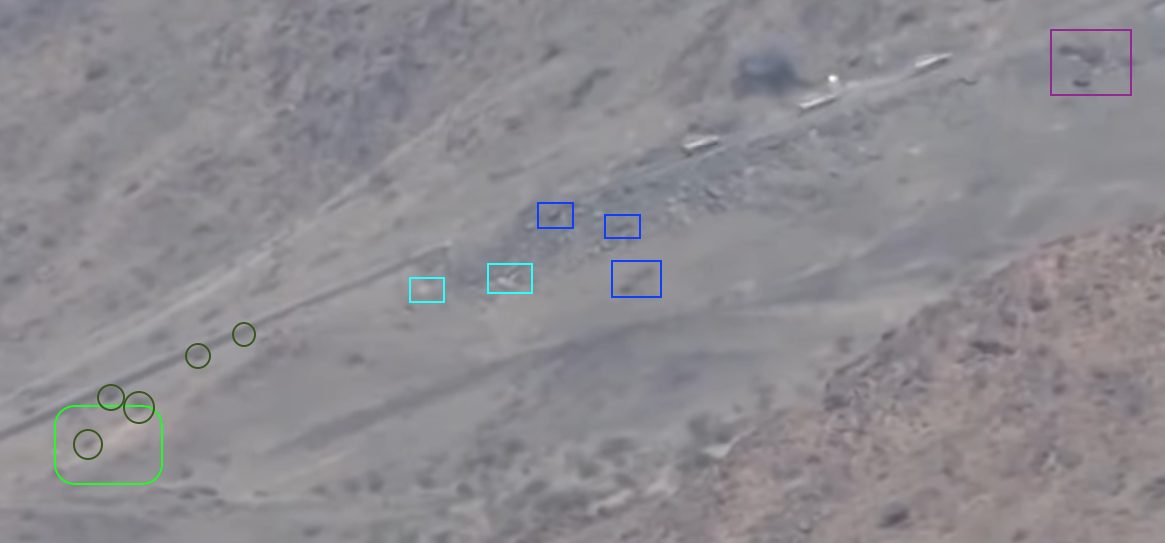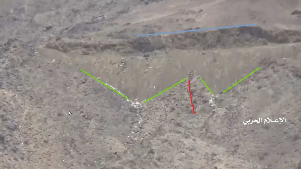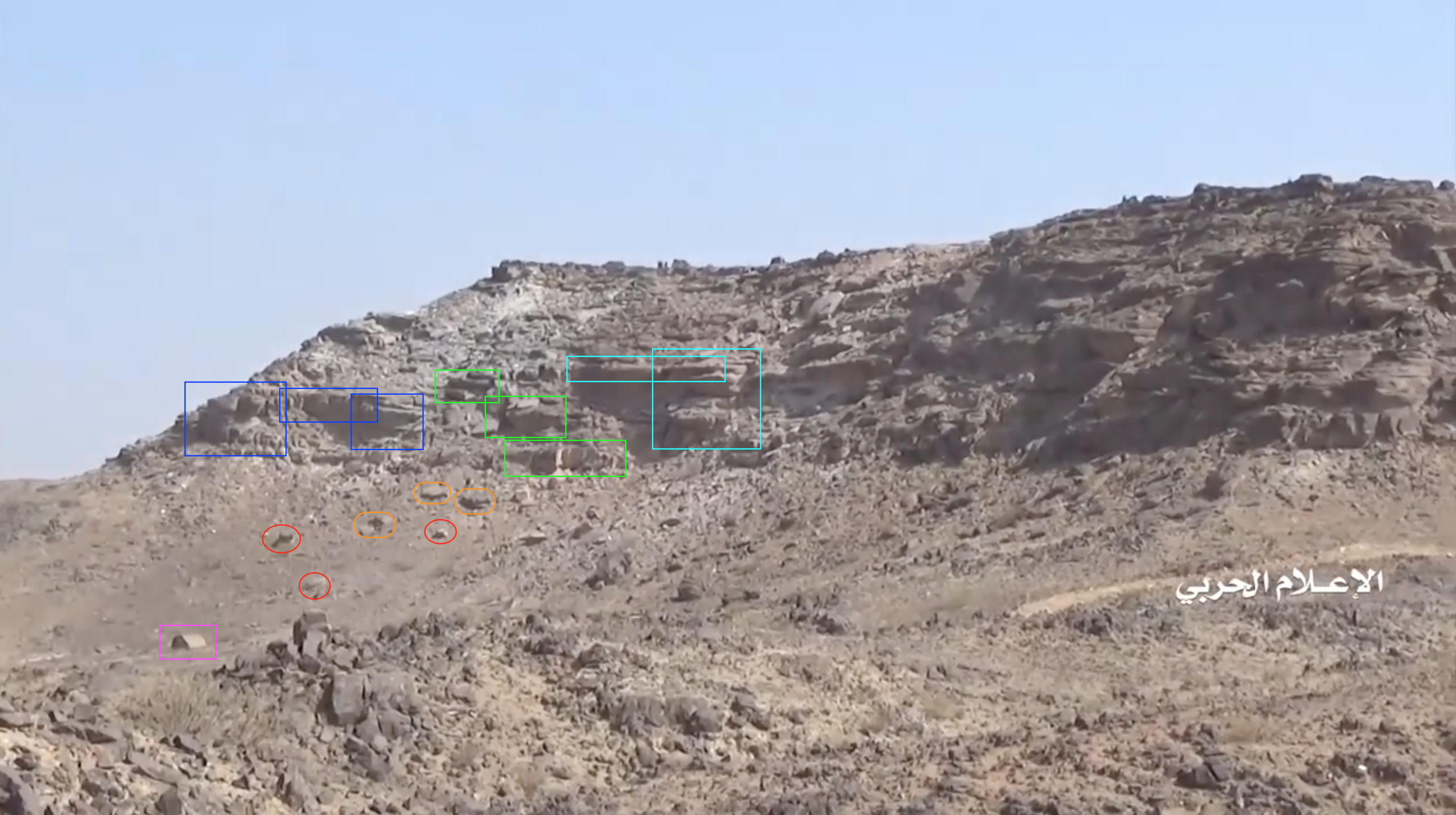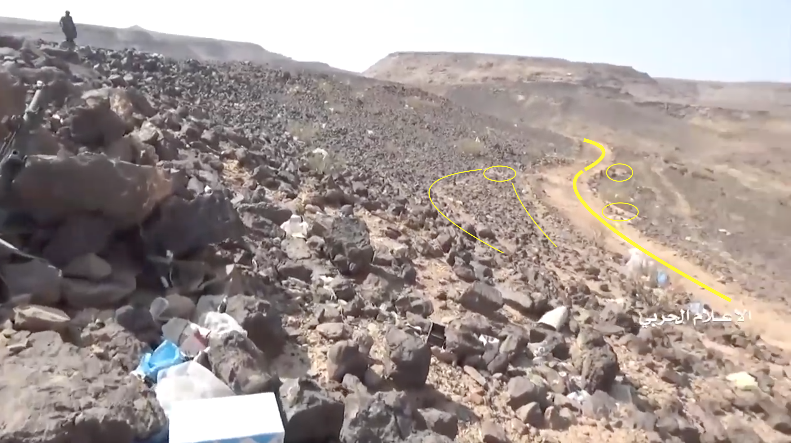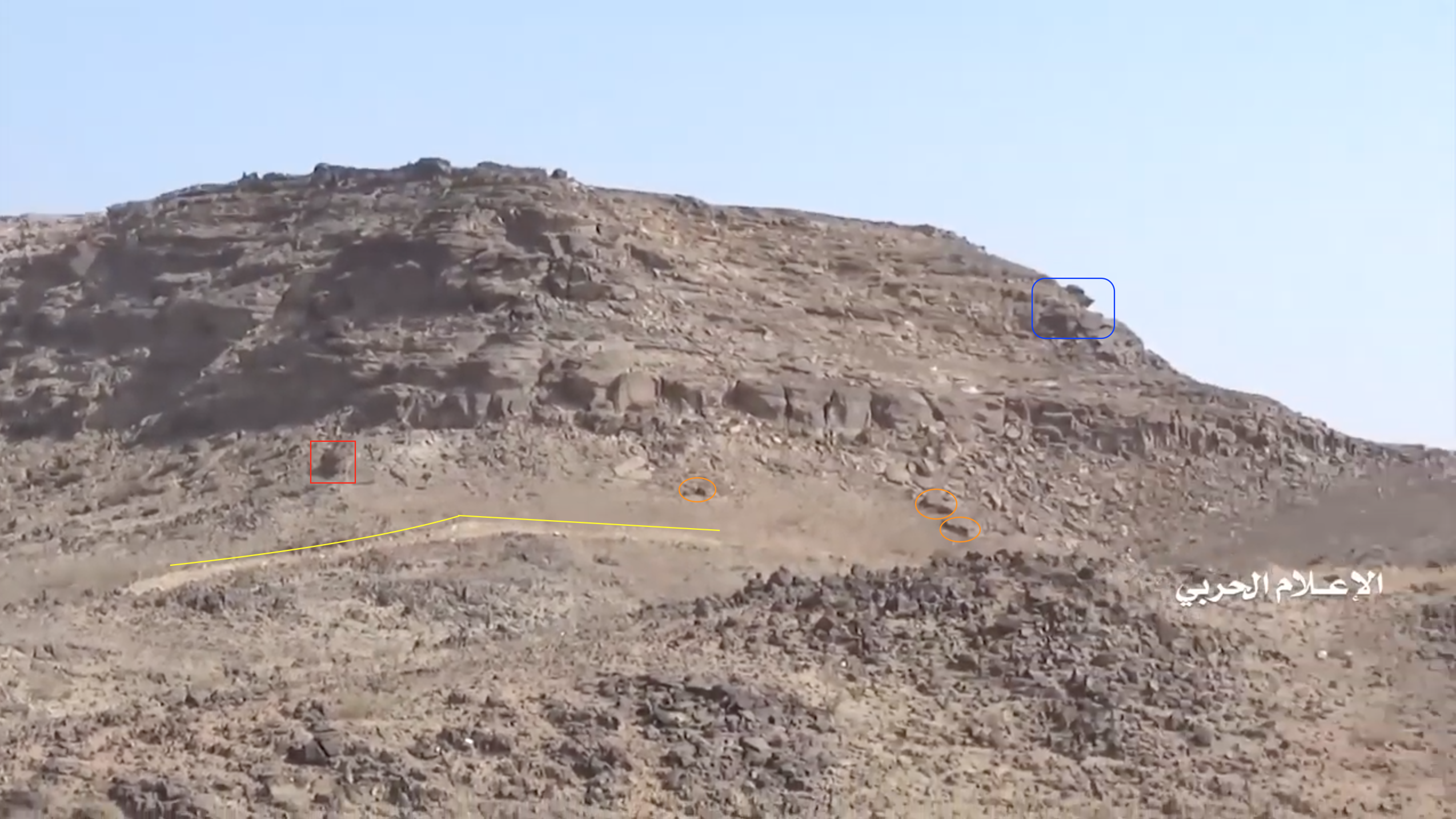At 24:23 the Yemeni cameraman turns southwest to record the explosion of – likely – an artillery shot. This allows to identify several elements in the adjecent canyon; from left to right: squared and round rocks (red), linear ground shape (orange line), pointy road (yellow), opposite cliff's rocks (blue), smaller rocks (light blue), a tree (green) next to a flat dusty area (orange square).
