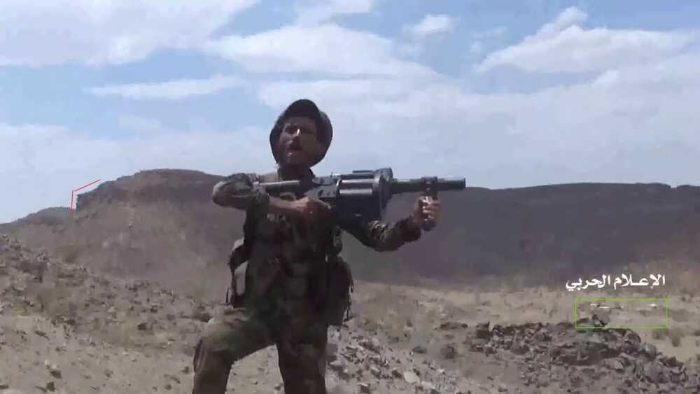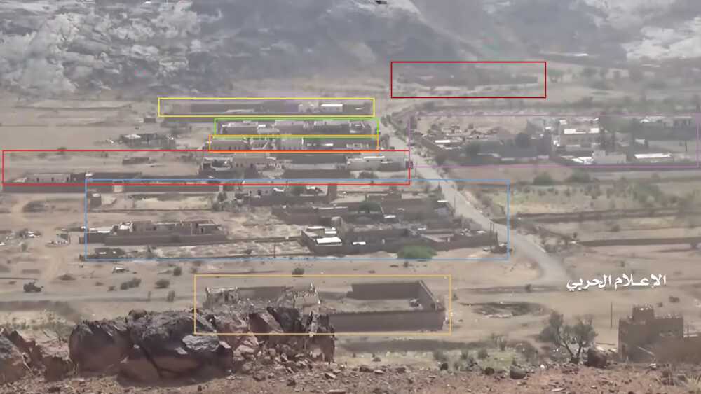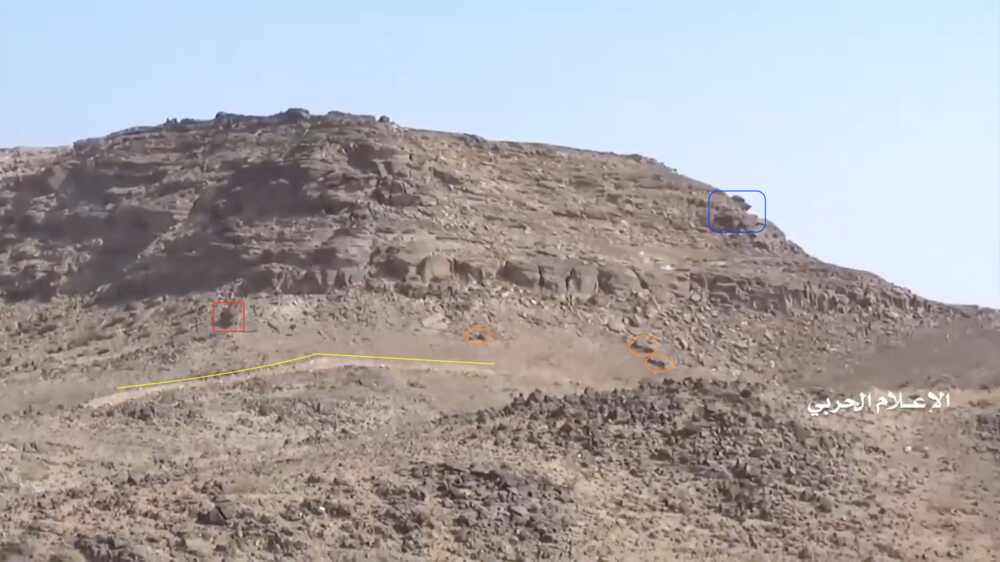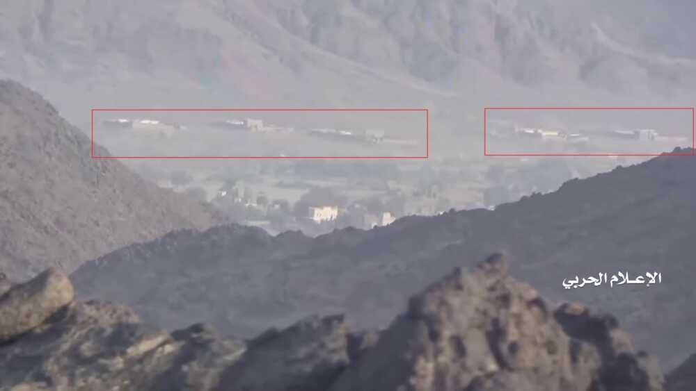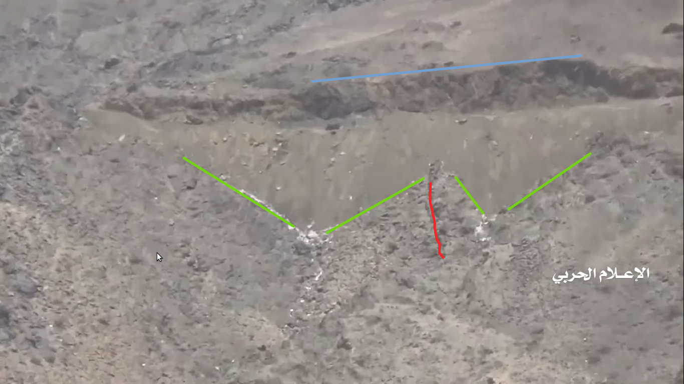 A fragment of this Houthi-made video, from 11:55-13:01, shows the destruction of a Saudi outpost on the mountain north of Alfare valley near an earlier destroyed pylon. This outpost and the pylon can be located on Google Maps.