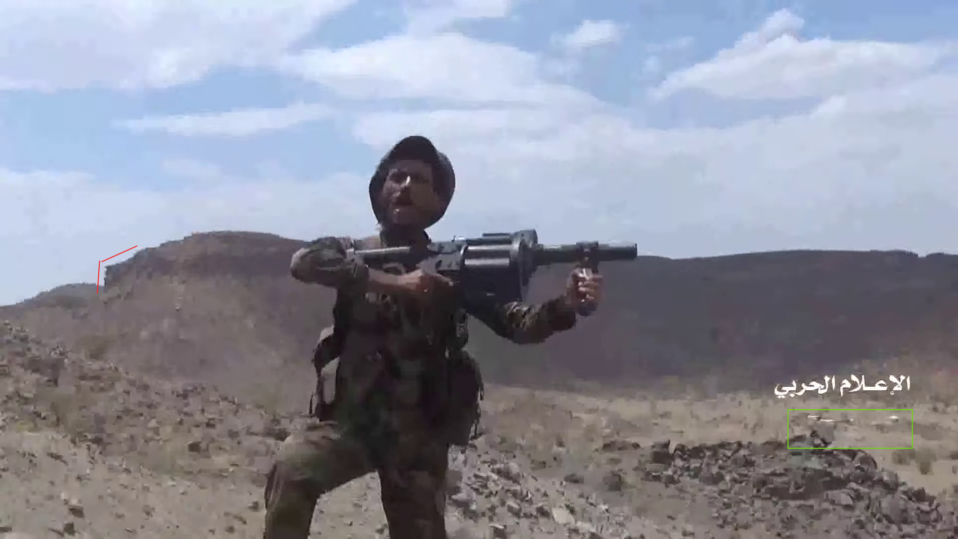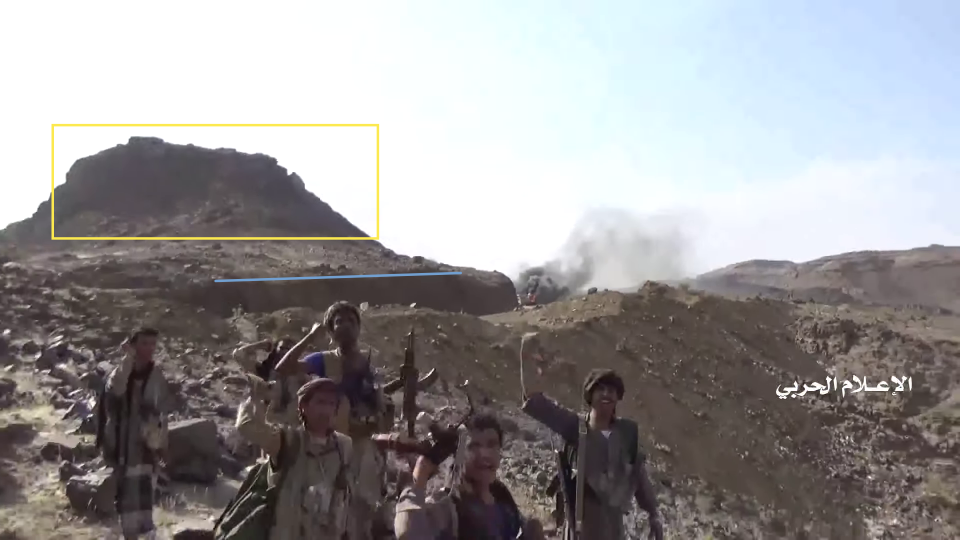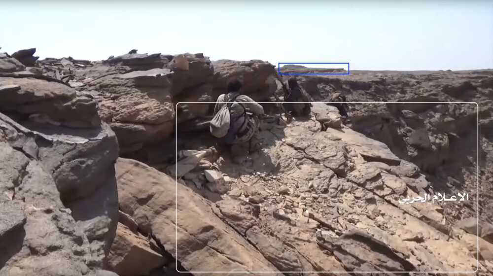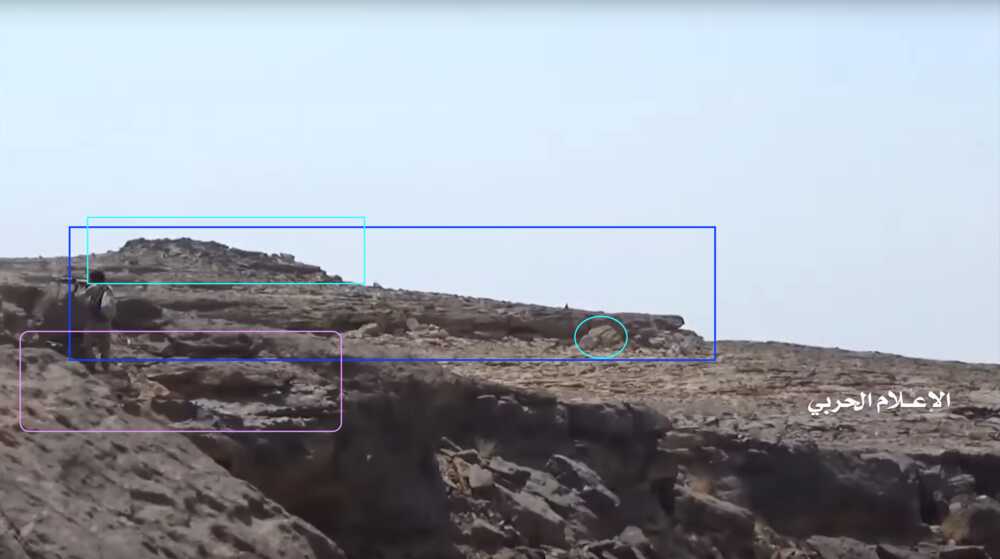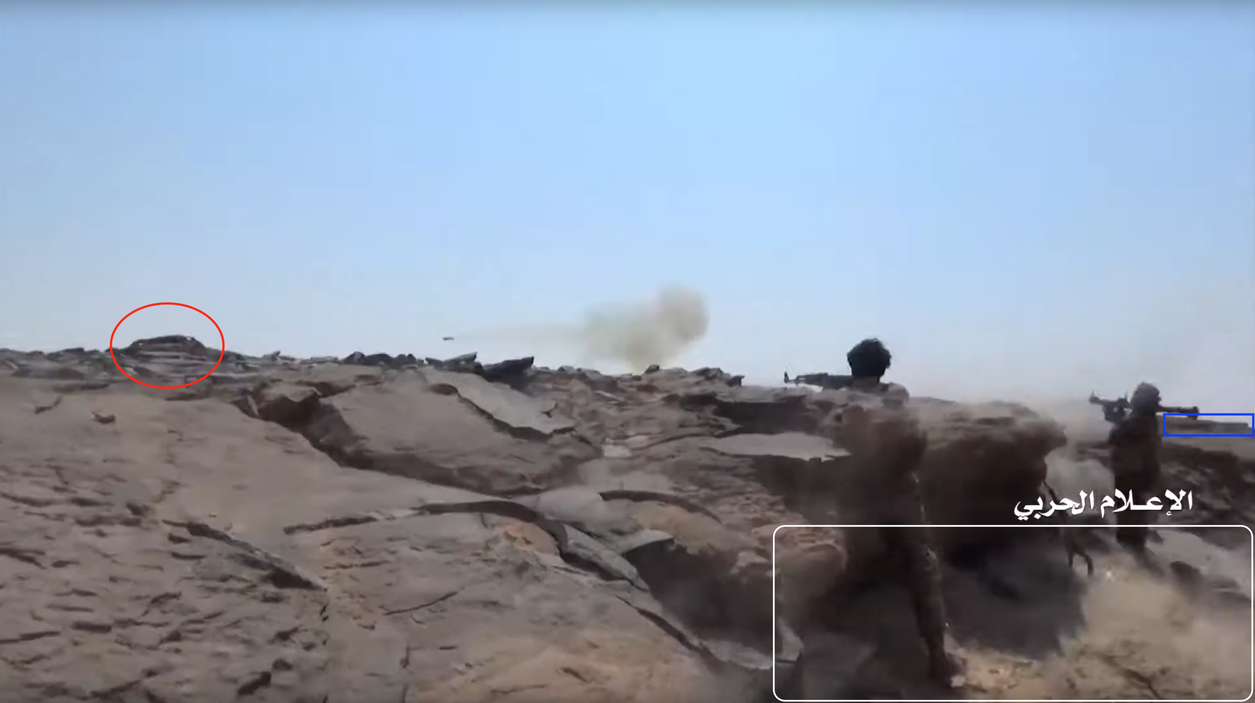 At min 22:59 of the video two Yemeni fighters are shooting at the target Saudi post (red circle). They are standing on a flat stone platform (white) extending from the side of a cliff. The area is shielded by a rock boulder – used as cover – that projects a marked shade on the platform. On the right edge of the frame is possible to spot a flat rock formation (blue) in the distance slightly elevating from the ground.