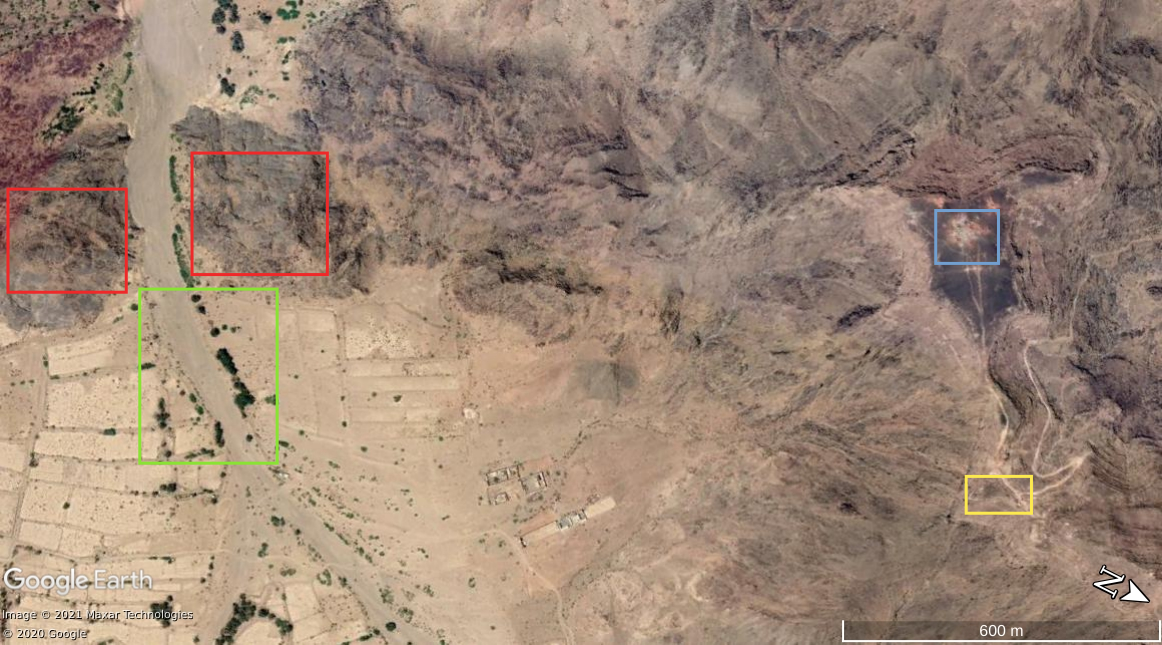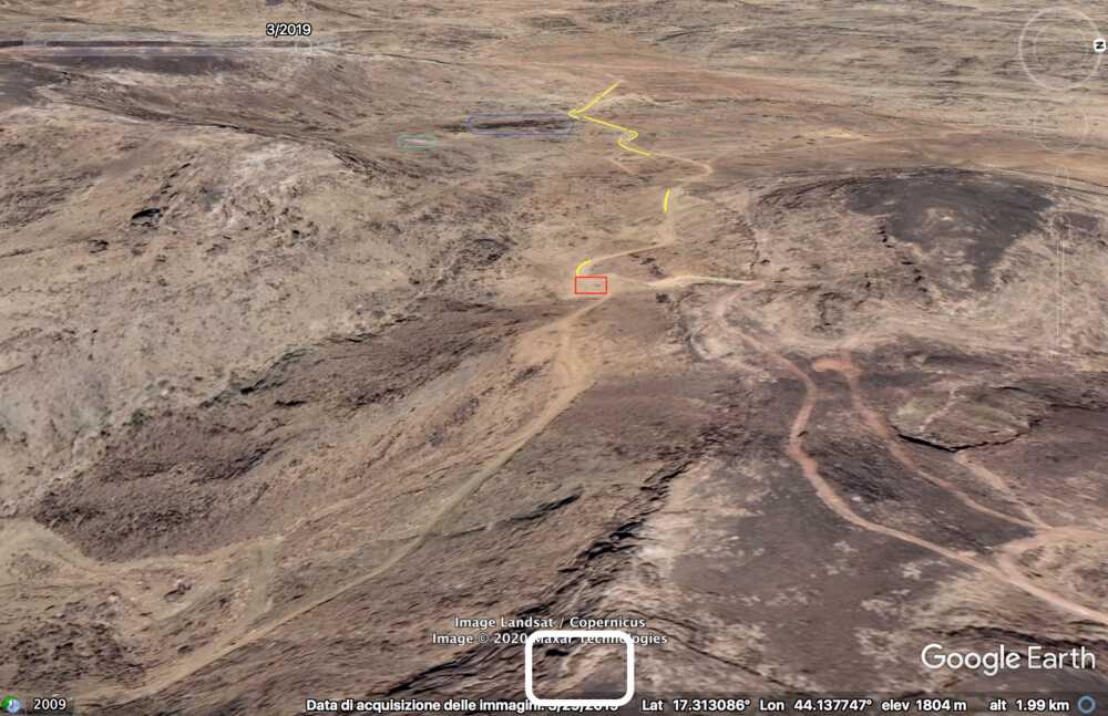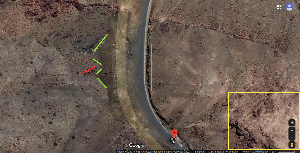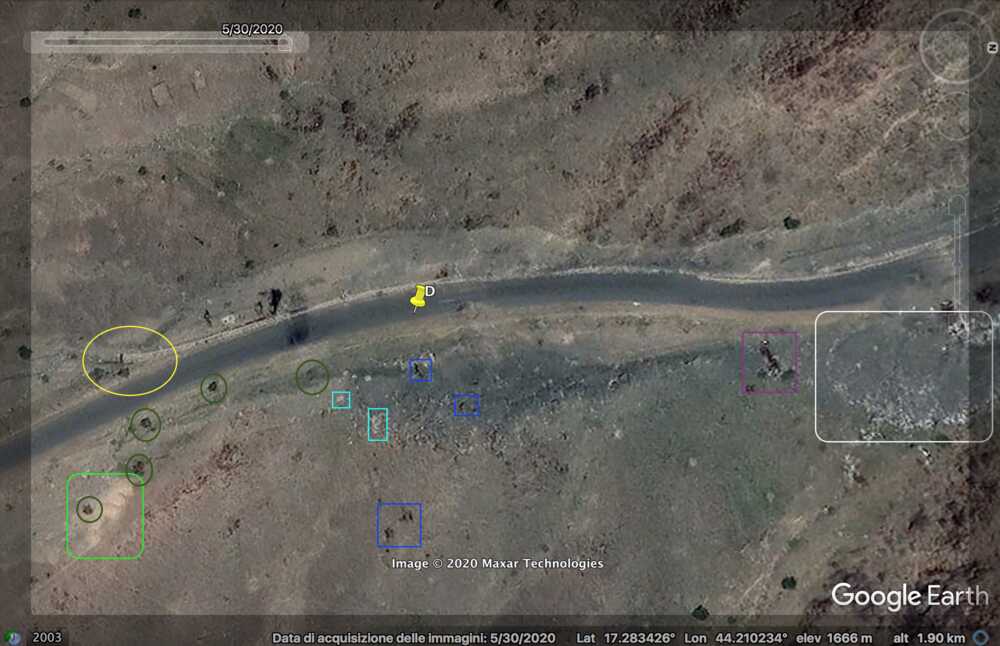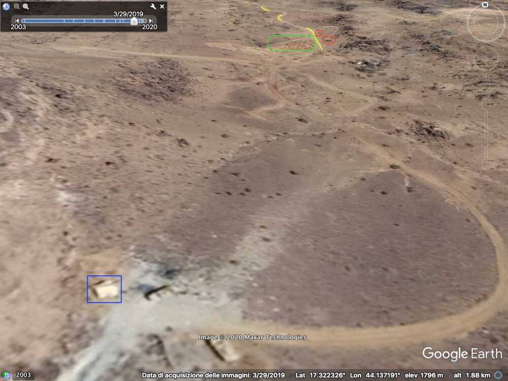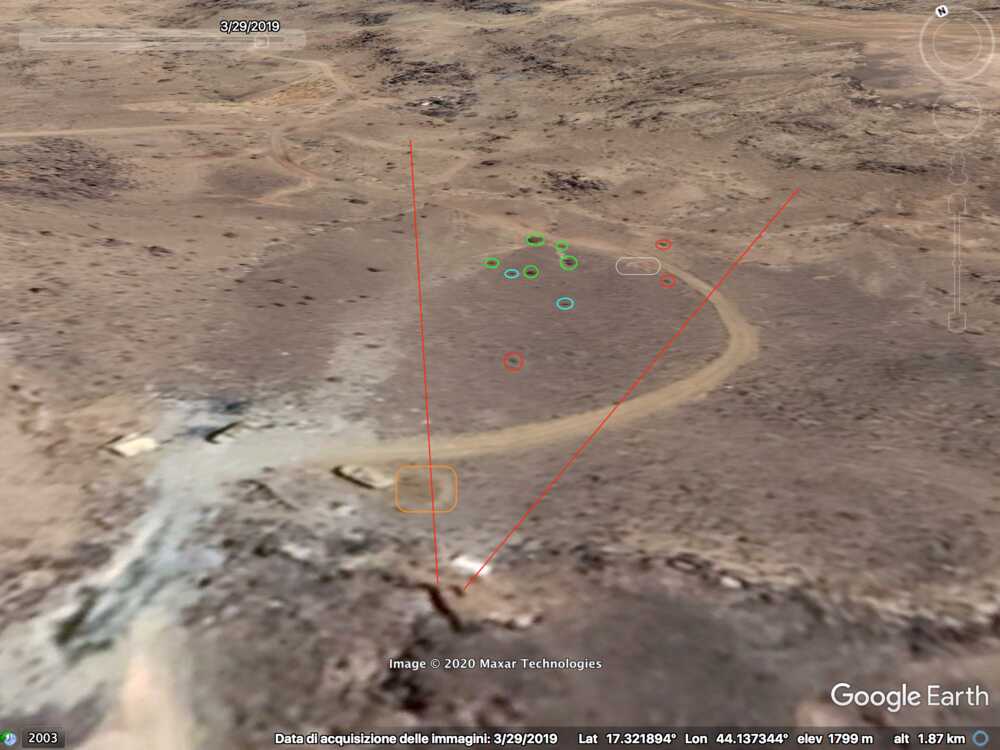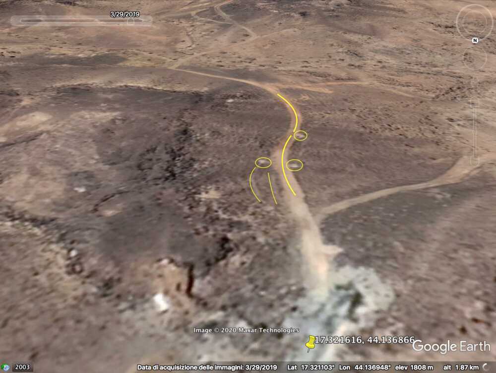 At 33:00 the Yemeni cameraman is entering the Saudi munition storage. Some elements of the background can be spotted on the top part of the image and identified in relation to the pale track, which takes a long and smooth curve to the left: a small mound of ground (orange), two small shrubs (light blue) followed by five shrubs (green) in a specific pattern, a whitish area (white) next to the road and aligned with the shrubs, and three rocks (red) that can be spotted by satellite.
