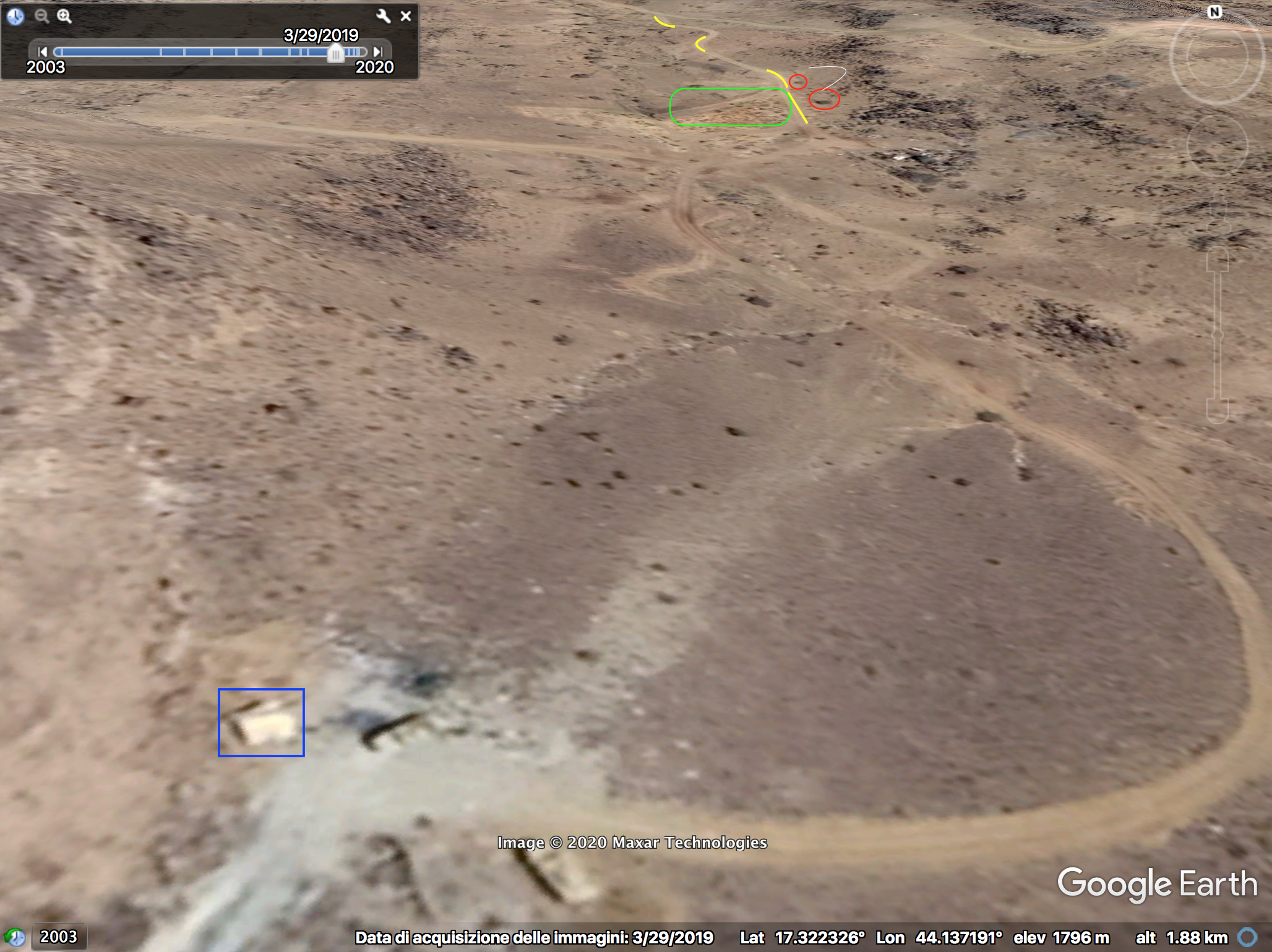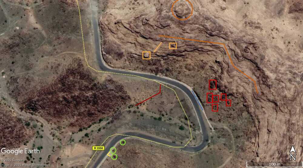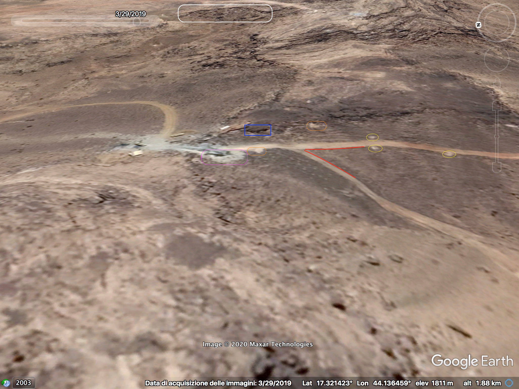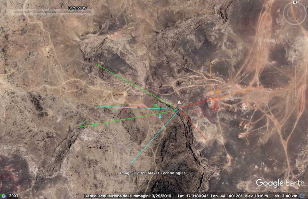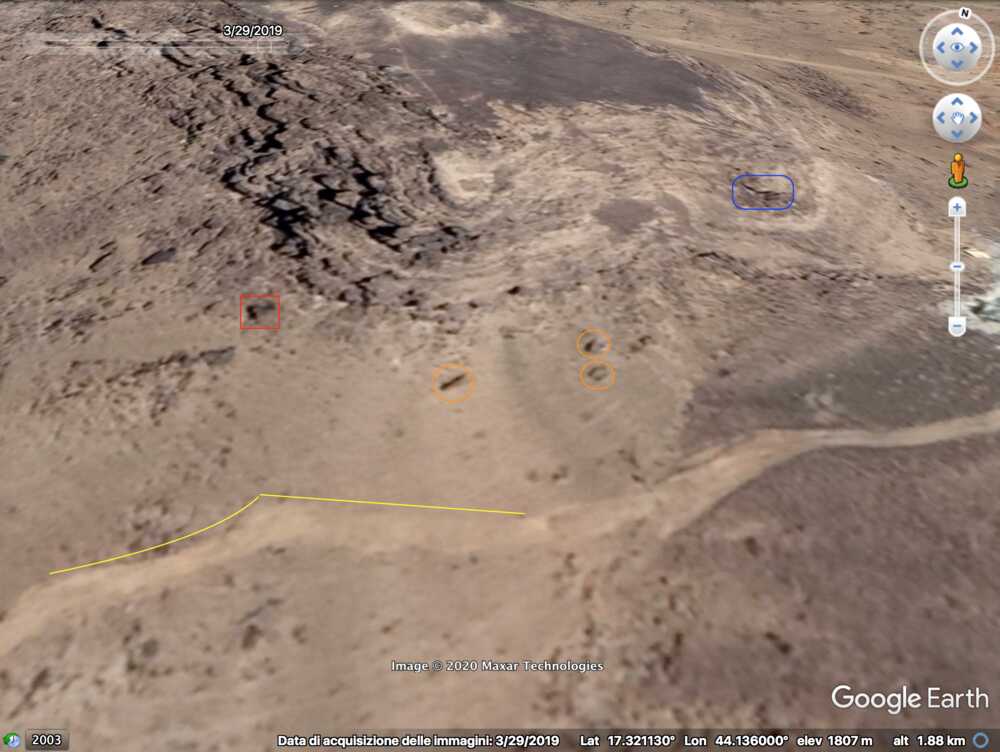At 33:00 the Yemeni cameraman is entering the Saudi munition storage. Some elements of the background can be spotted on the top part of the image and identified in relation to the pale track, which takes a long and smooth curve to the left: a small mound of ground (orange), two small shrubs (light blue) followed by five shrubs (green) in a specific pattern, a whitish area (white) next to the road and aligned with the shrubs, and three rocks (red) that can be spotted by satellite.