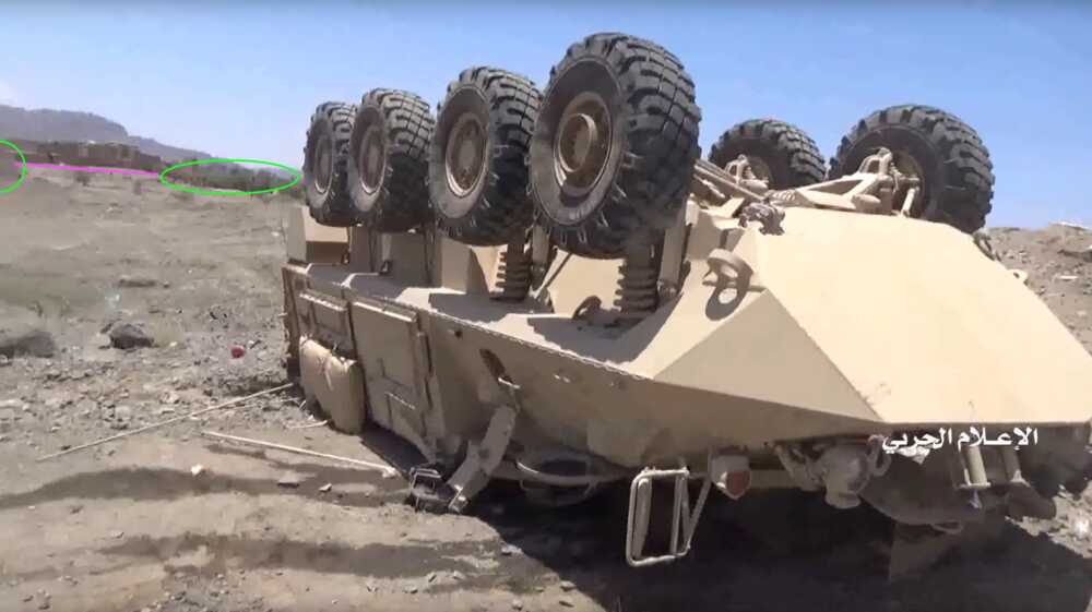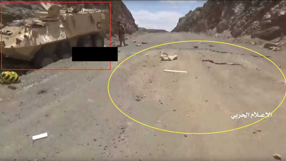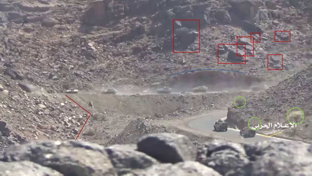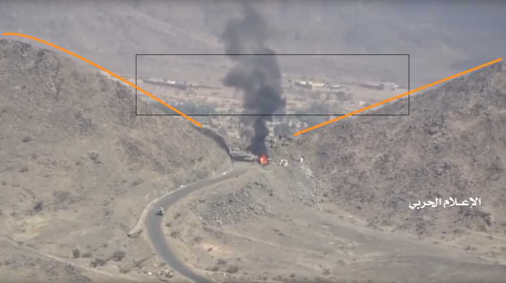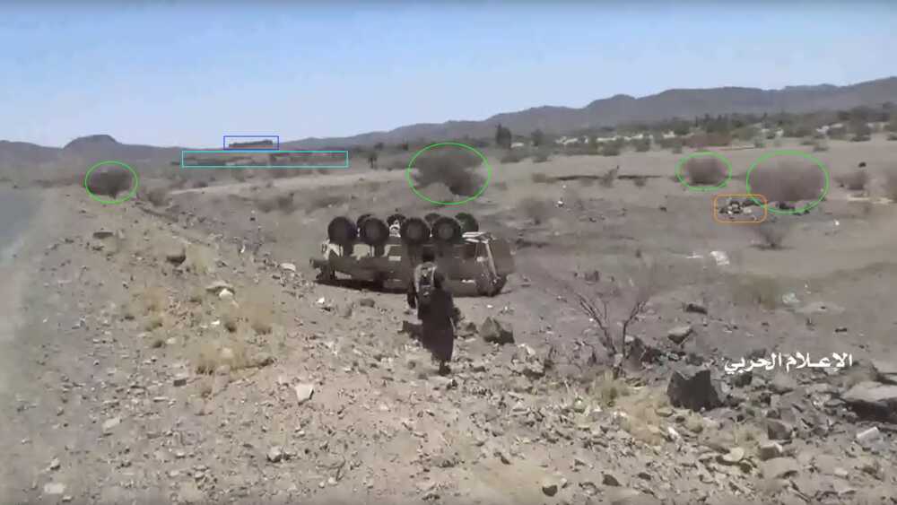 This Houthi-made report shows from 14:49 to 18:31 the capture and destruction of 3 M-ATVs. The wreckages of these M-ATVs can be found on Google maps-satellite pictures and were not yet present on the imagery from 21 July 2019. The video fragment starts with a shot on the road and zooms in at the ambush spot before the turn.