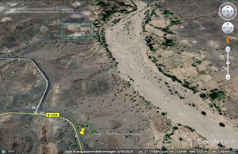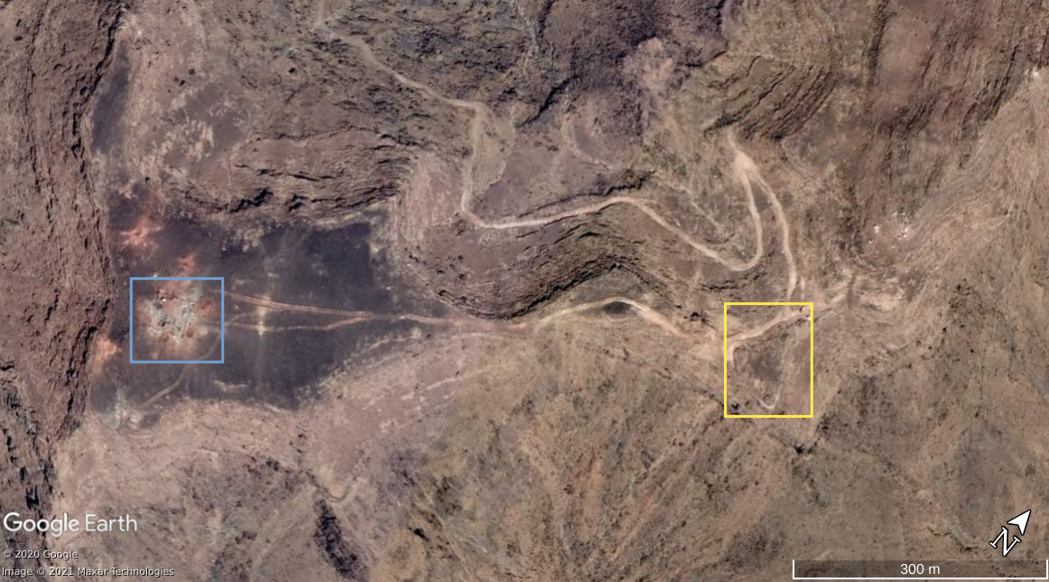On Google Maps this Saudi position is indicated as a gas station. The nearby mountains and slopes (orange) and the curving road visible throughout the images made at the outpost match with the satellite imagery.
