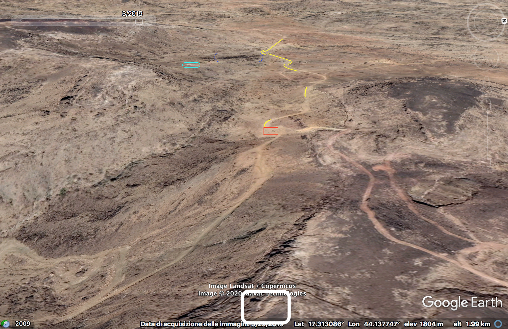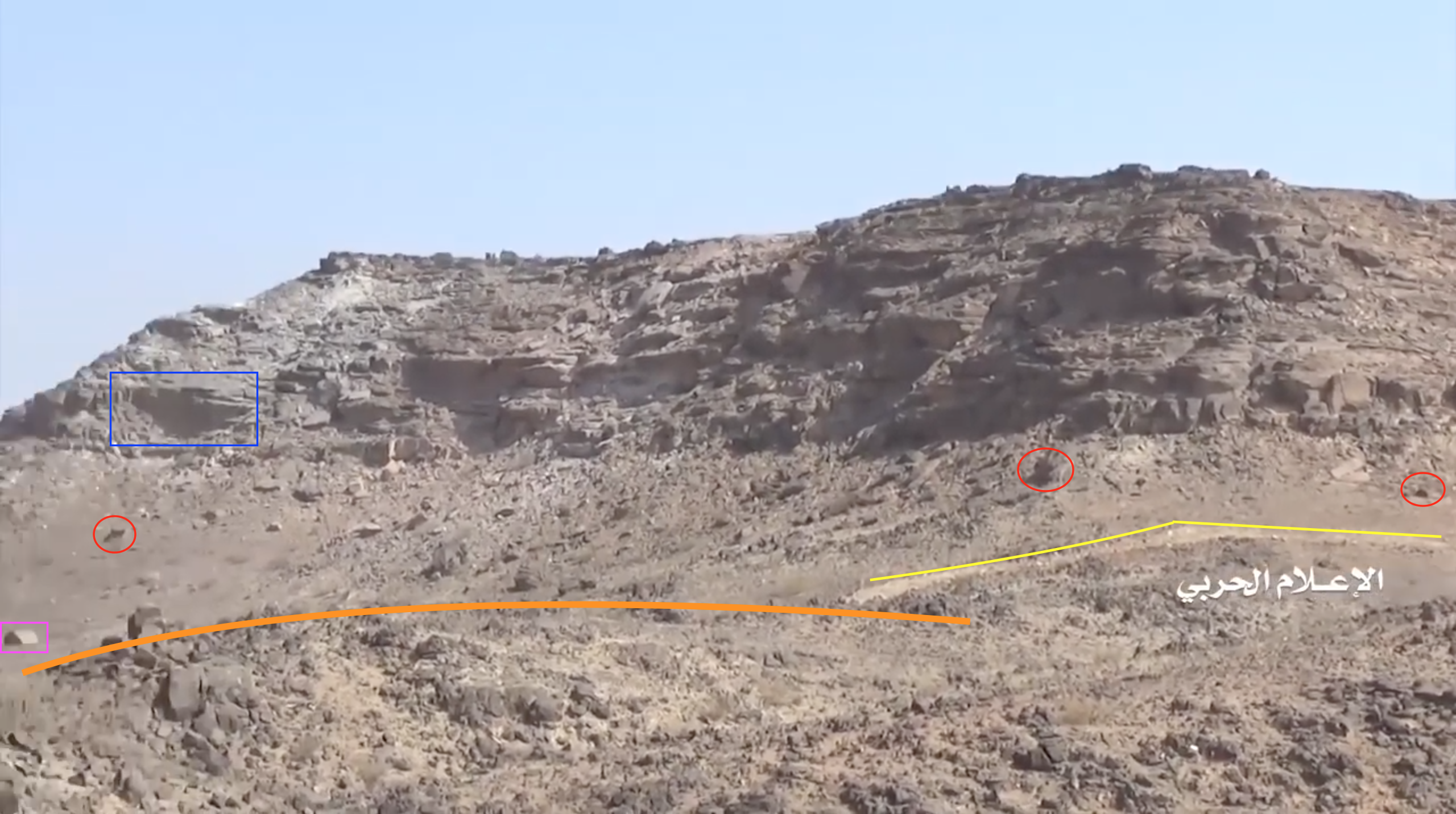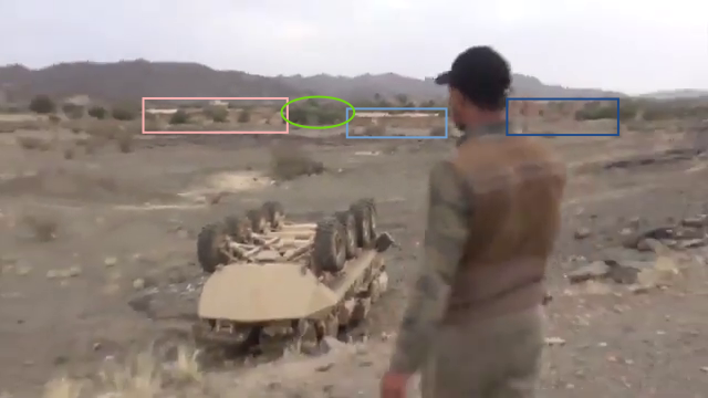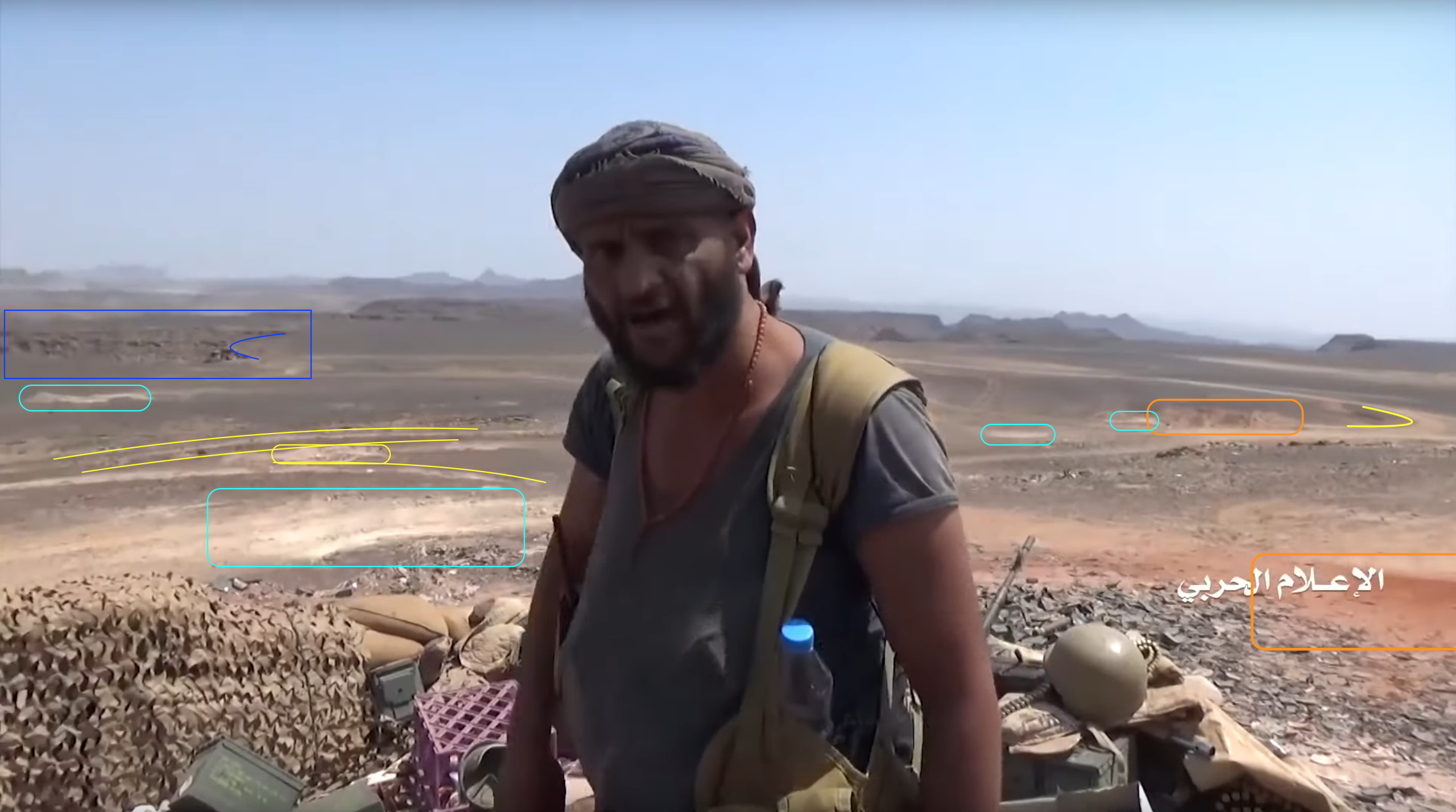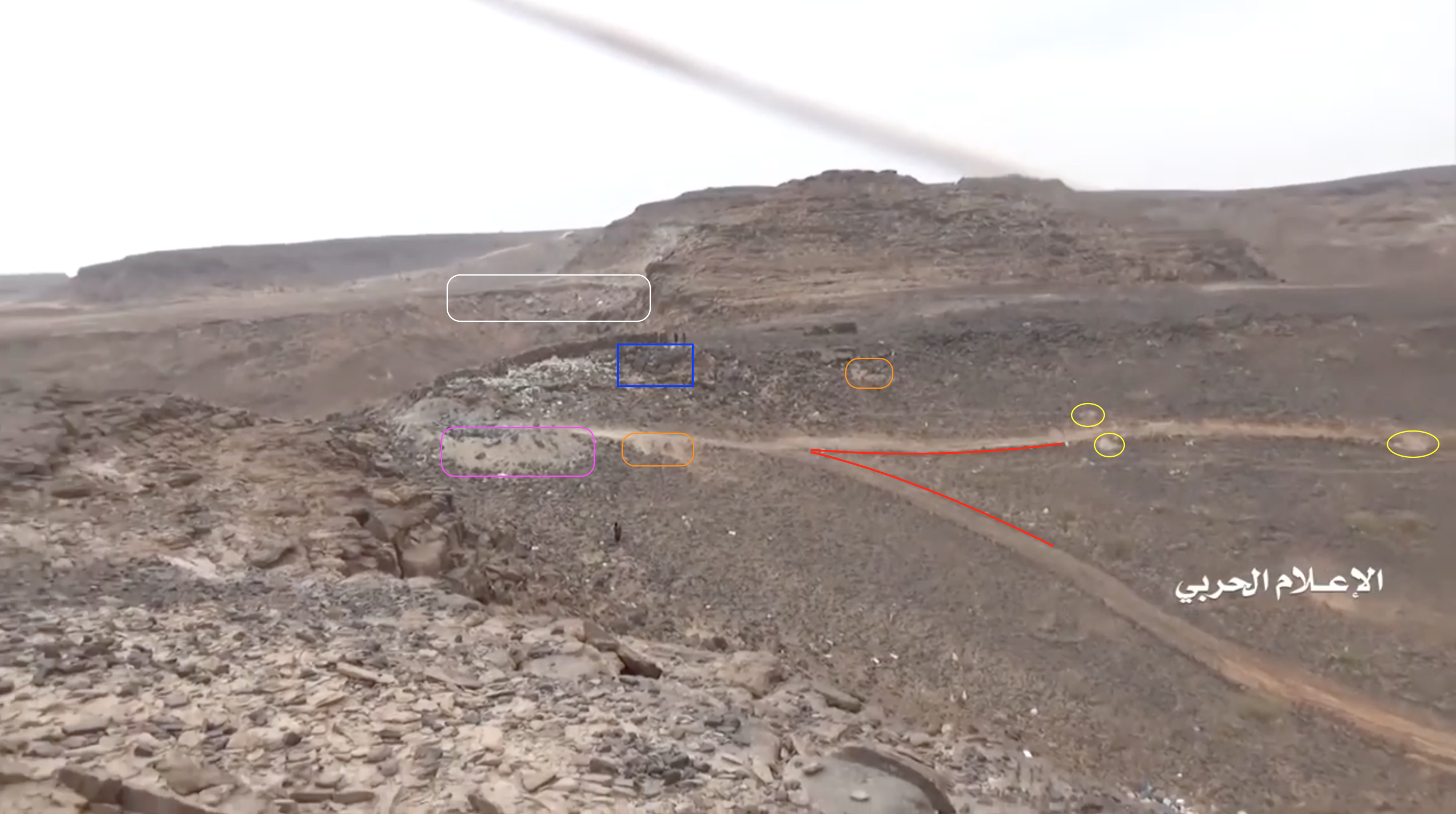 Later in the video the Yemeni fighters conquer the target position and start recording from the inside the post. At min 26:19, several elements in the plane behind the post can be identified. On the left from the top: a bracket-shaped cliff in the distance (blue), a whitish area on the ground (light blue), three tracks in a specific pattern (yellow) and a second whitish area (light blue). On the right two white spots (light blue) are aligned to some loose ground (orange) and the left turn of a track (yellow), and below, in the foreground, an area of dark red soil (orange).