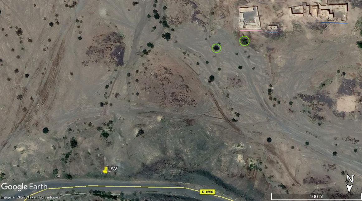 The wreckage of a LAV at the entrance of the Jabara valley provides visual evidence of the attempt by the Saudi National Guard to break the siege. This wreckage is visible on Google Maps, while it is absent on earlier satellite pictures. Some Houthi reports on this battle show this wreckage and its surroundings in detail. This allows us to verify that the vehicle at this spot on the satellite pictures is indeed a LAV belonging to the Saudi National Guard.