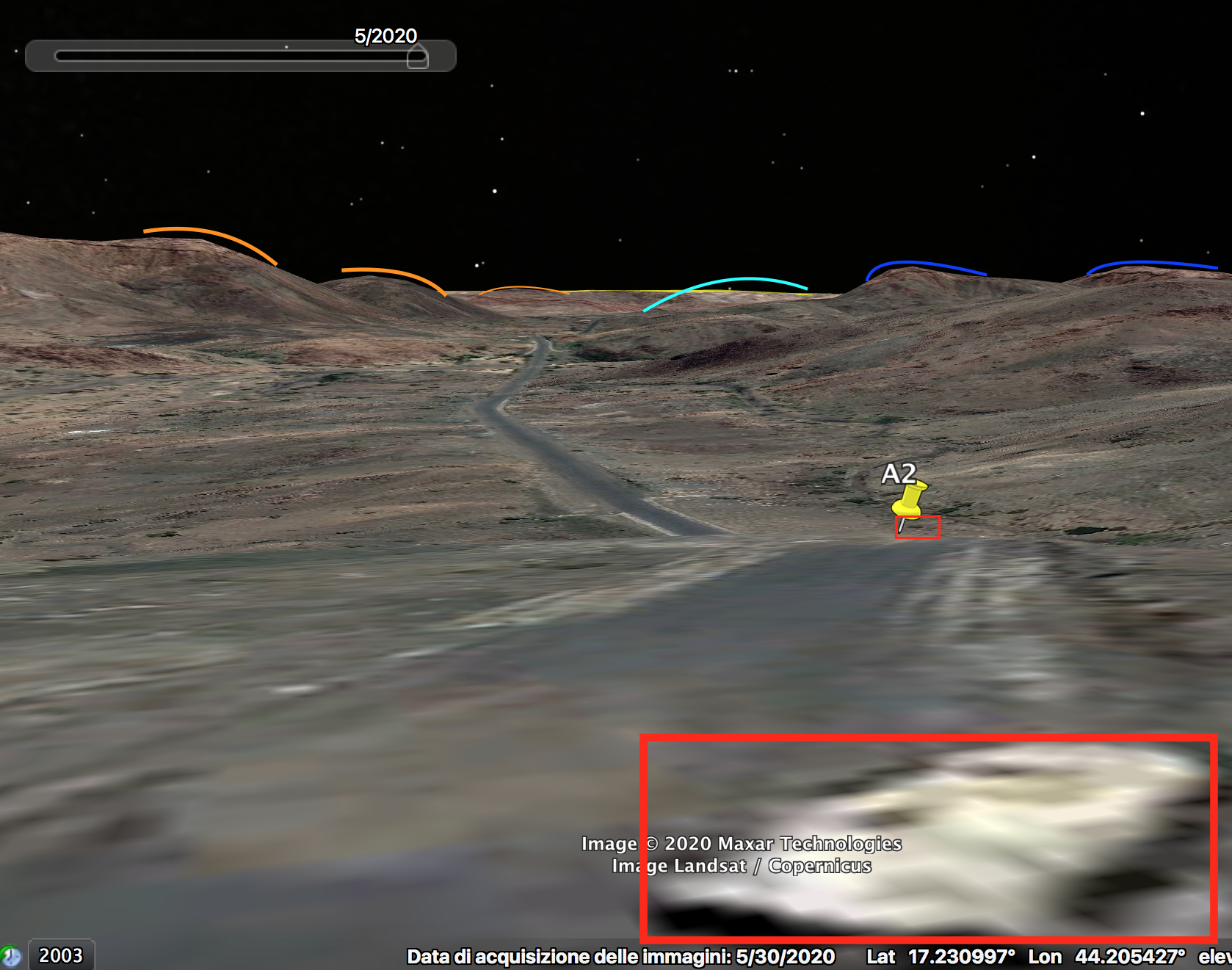 The road is visible only in portions, but the overall shape can be identified through satellite. The central part is occupied by a dark elevation (blue), aligned with a pale mark on the ground on the left (light blue).