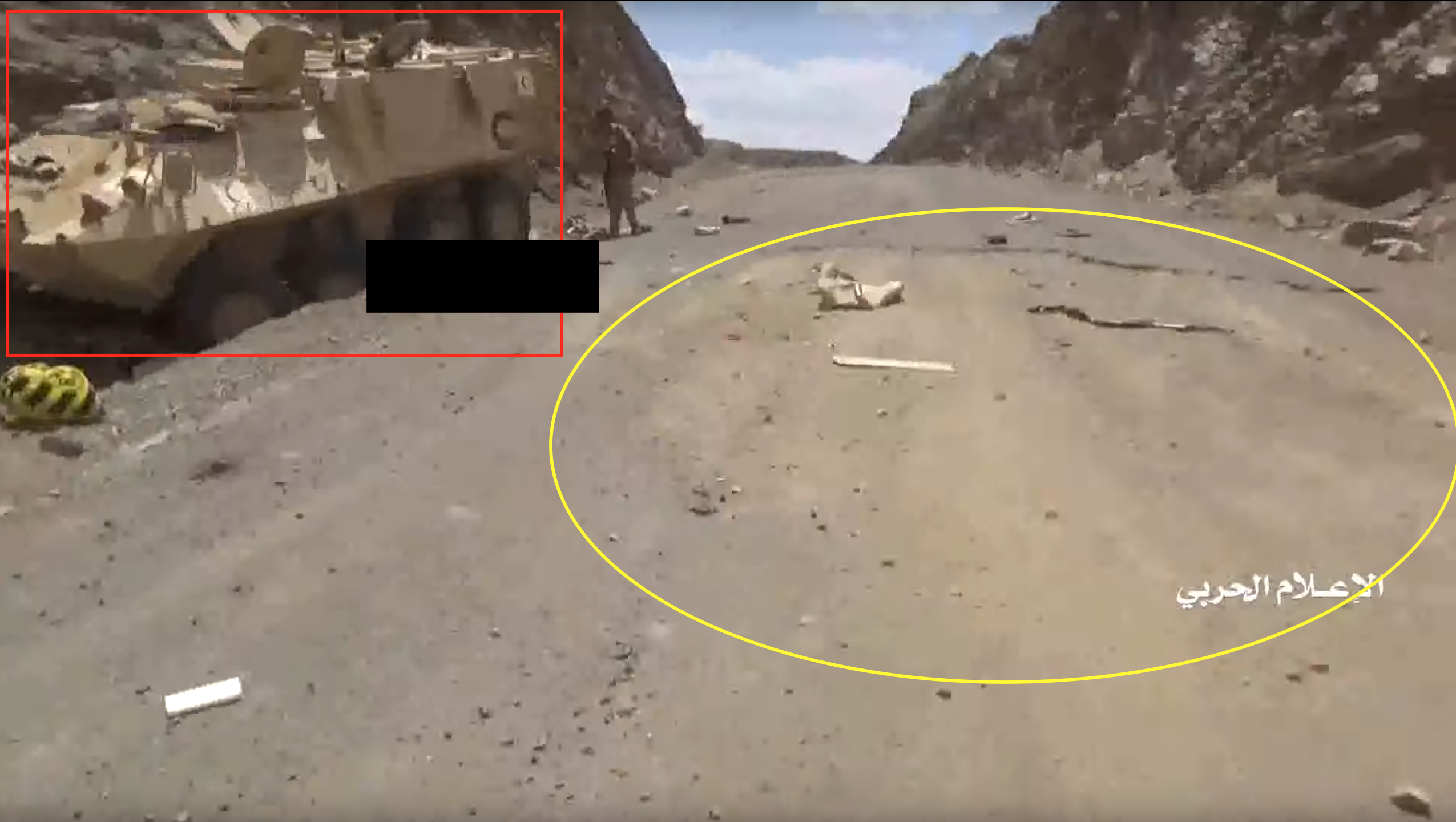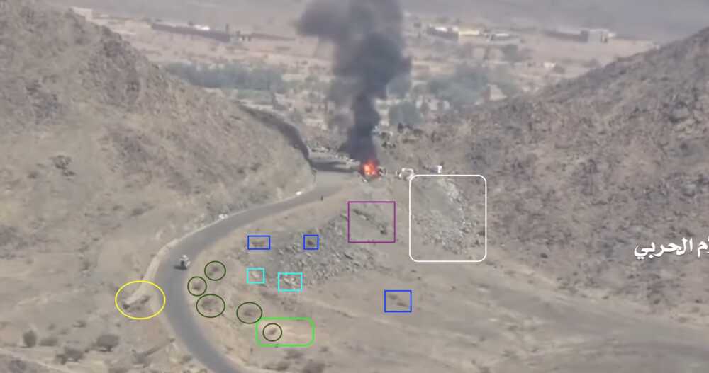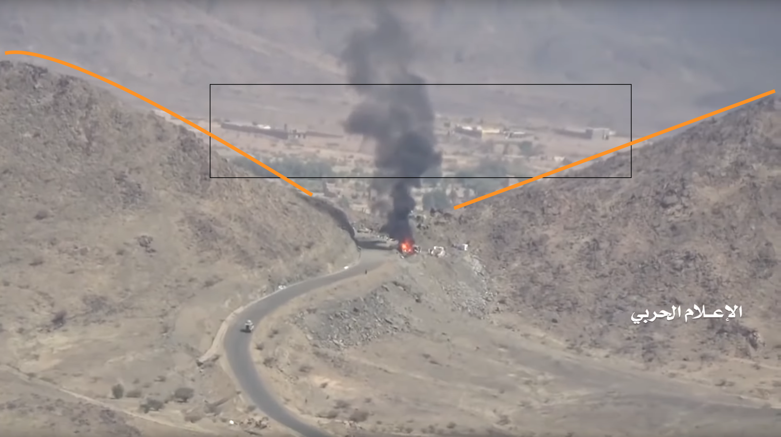 The Houthi-made report shows (from 20:08 to 20:58) several LAVs and other vehicles driving at high speed towards the Alfare valley in the north, whilst under fire. This report shows similar scenes at other spots, but this particular scene can be easily verified due to the particular shape of road, a rectangular shift along the mountains. Further we can also point to several visual details which match with the satellites images.