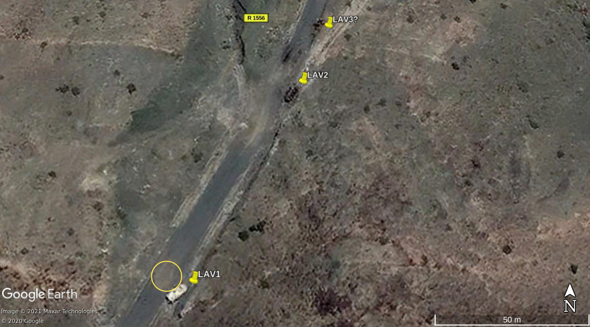 During this retreat, multiple LAVs seem to have been destroyed along the road. Several images in this video can be geolocated and linked to wreckage visible on the satellite pictures.