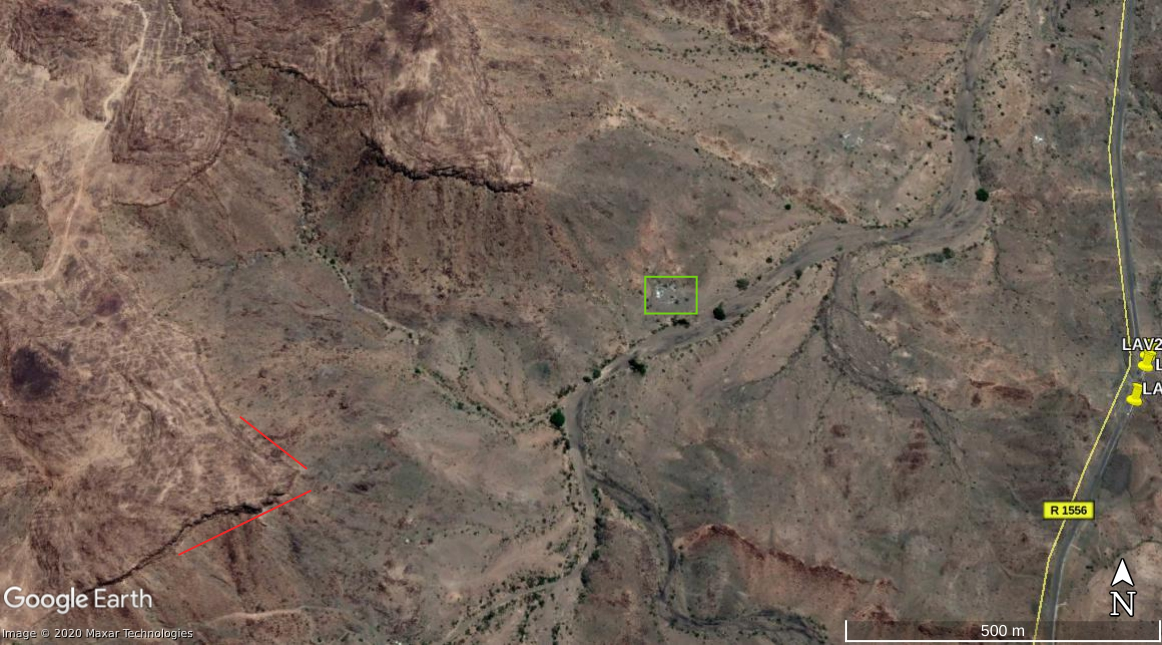 The video shows a view in 2 directions. The first shows a small plateau (yellow) and a view into the valley, with the hills (red) enclosing the narrow passage between the eastern and western part of Alfare valley. The pattern of the trees (green) visible in the valley matches exactly with the satellite imagery.