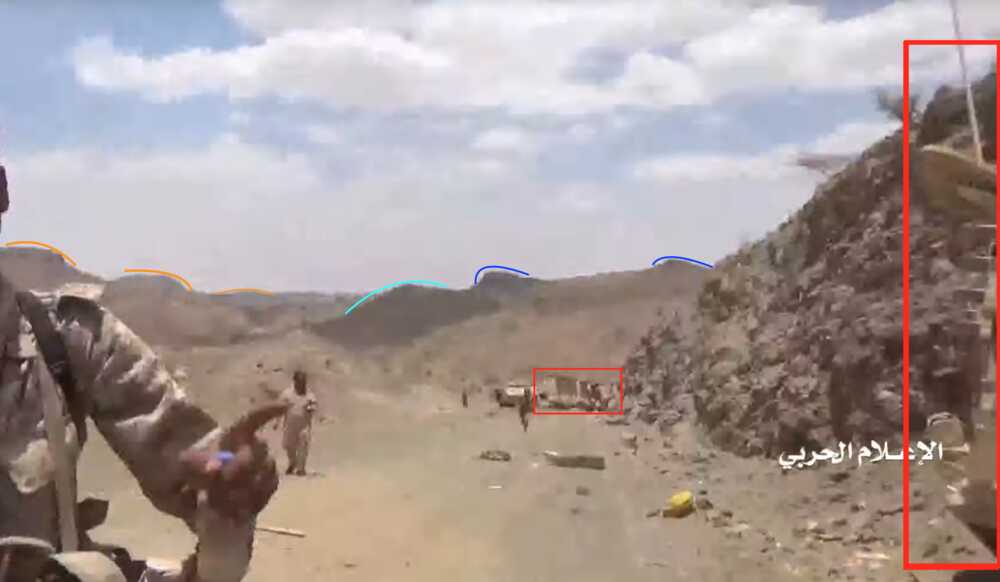 The footage of the fighting during this first phase is more limited and difficult to geolocate. It shows mostly the capture of makeshift fortifications, probably in the hills around the Jabara valley, and the destruction of M-ATVs. The material released by the Houthi further shows the aftermath with images of surrendering and captured Yemeni fighters and captured vehicles.