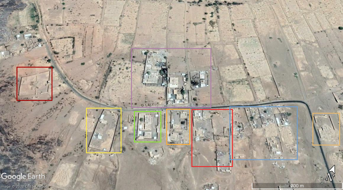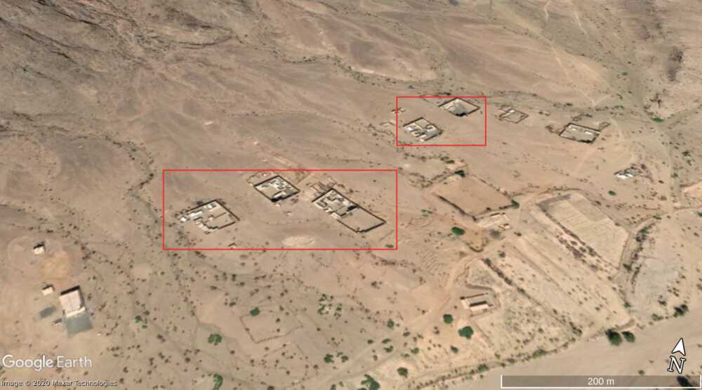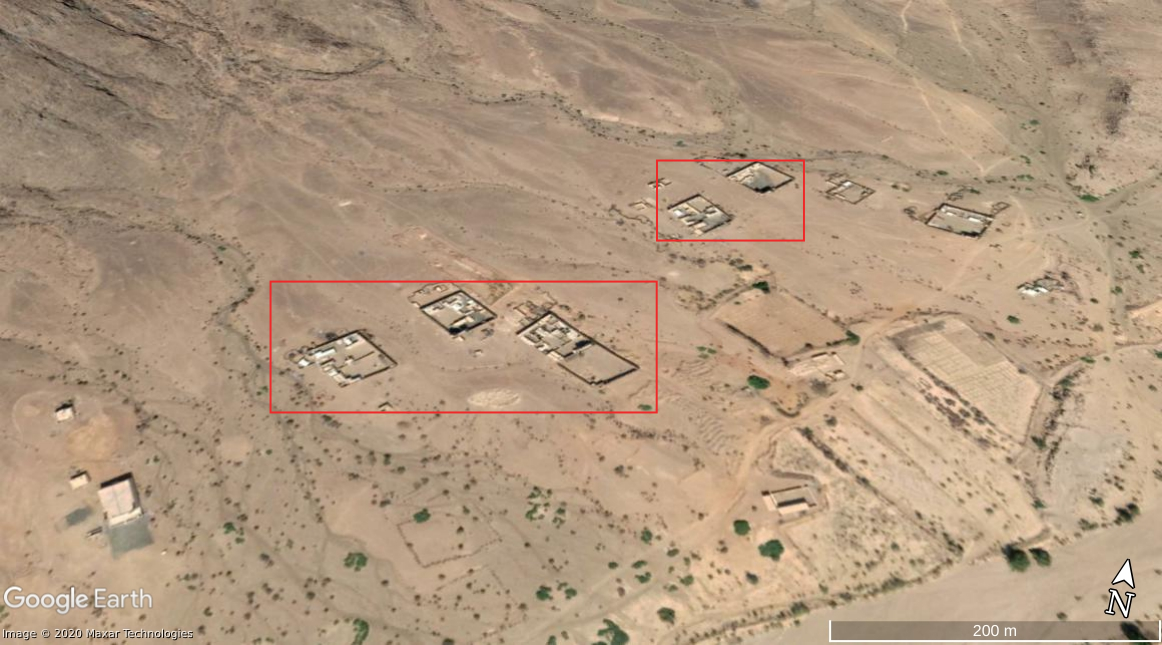 The views on Alfare valley can be matched as well. In the view from the outpost (4:50-4:58) we can recognize 5 compounds (red) situated at the northern side of Alfare valley.