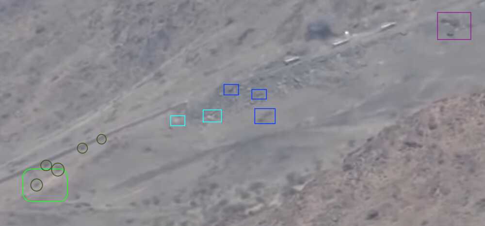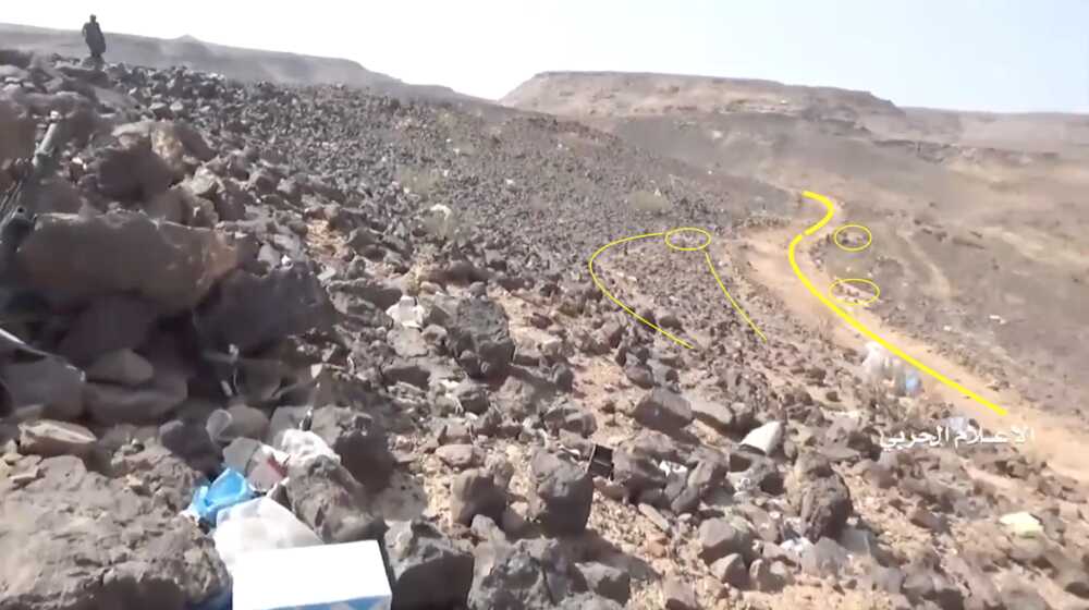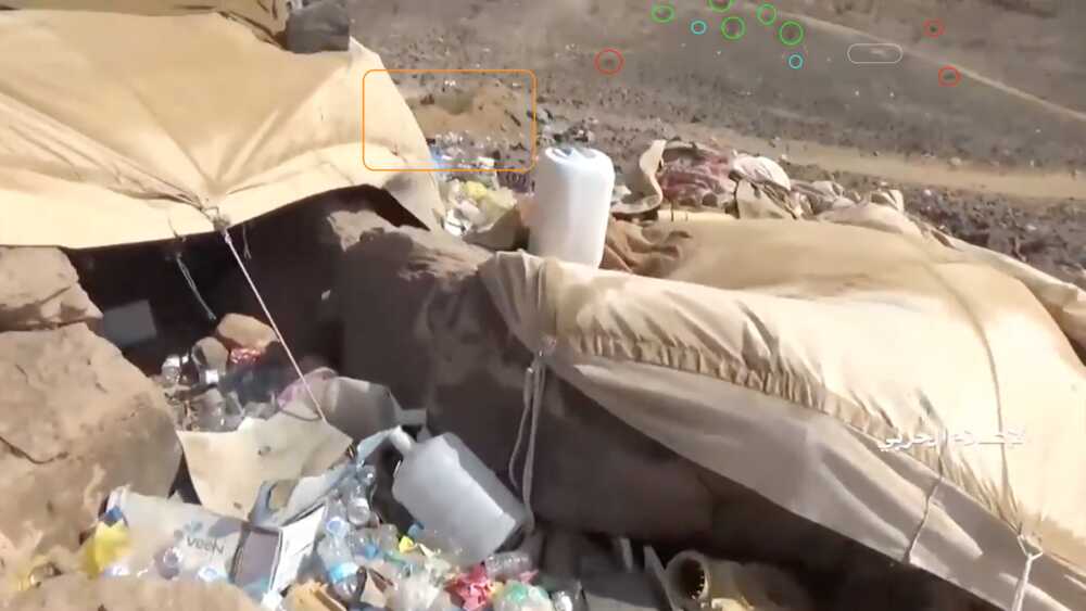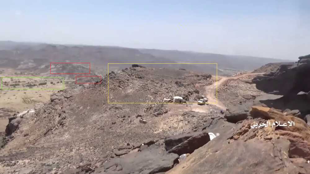 The location is also confirmed through the video fragment showing a Saudi air raid on the pylon position to counter the Houthi attack, both seen from the valley and from the viewpoint near the outpost (12:21-13:00).