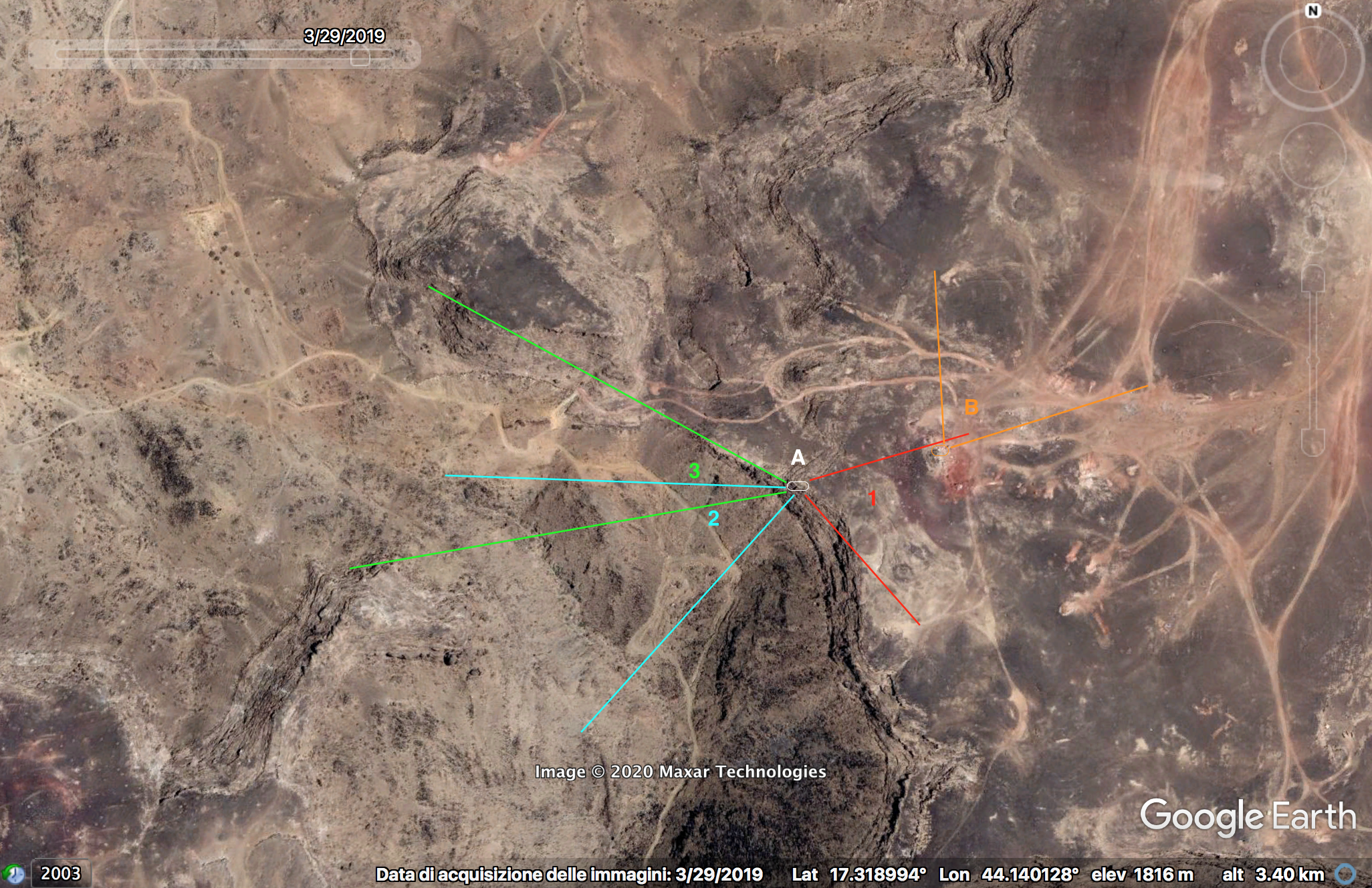 This outpost can be found on Google Maps.The video shows three different perspectives (1, 2, 3) recorded from the same area (A) from which the outpost was attacked.