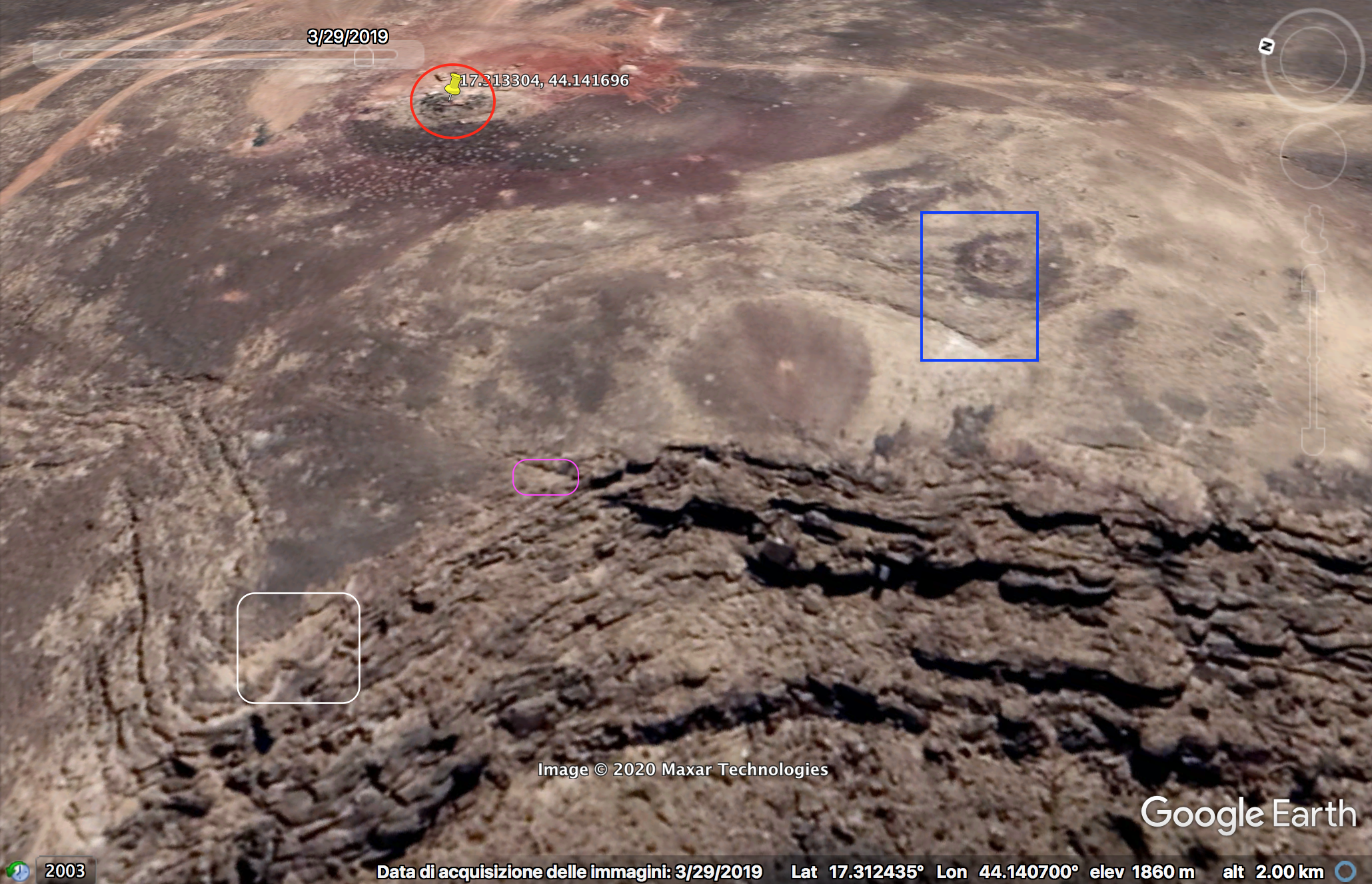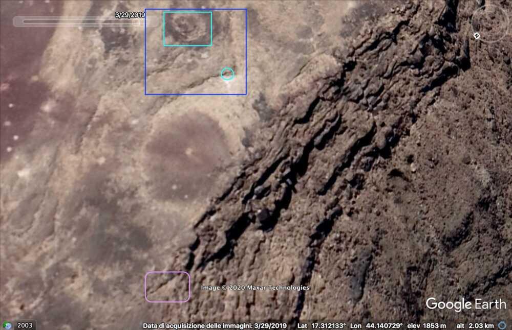 A wider satellite image shows all the elements identified so far: Saudi post (red), main natural platform (white), second smaller platform (purple), elevation with hill and sharp edges (blue).