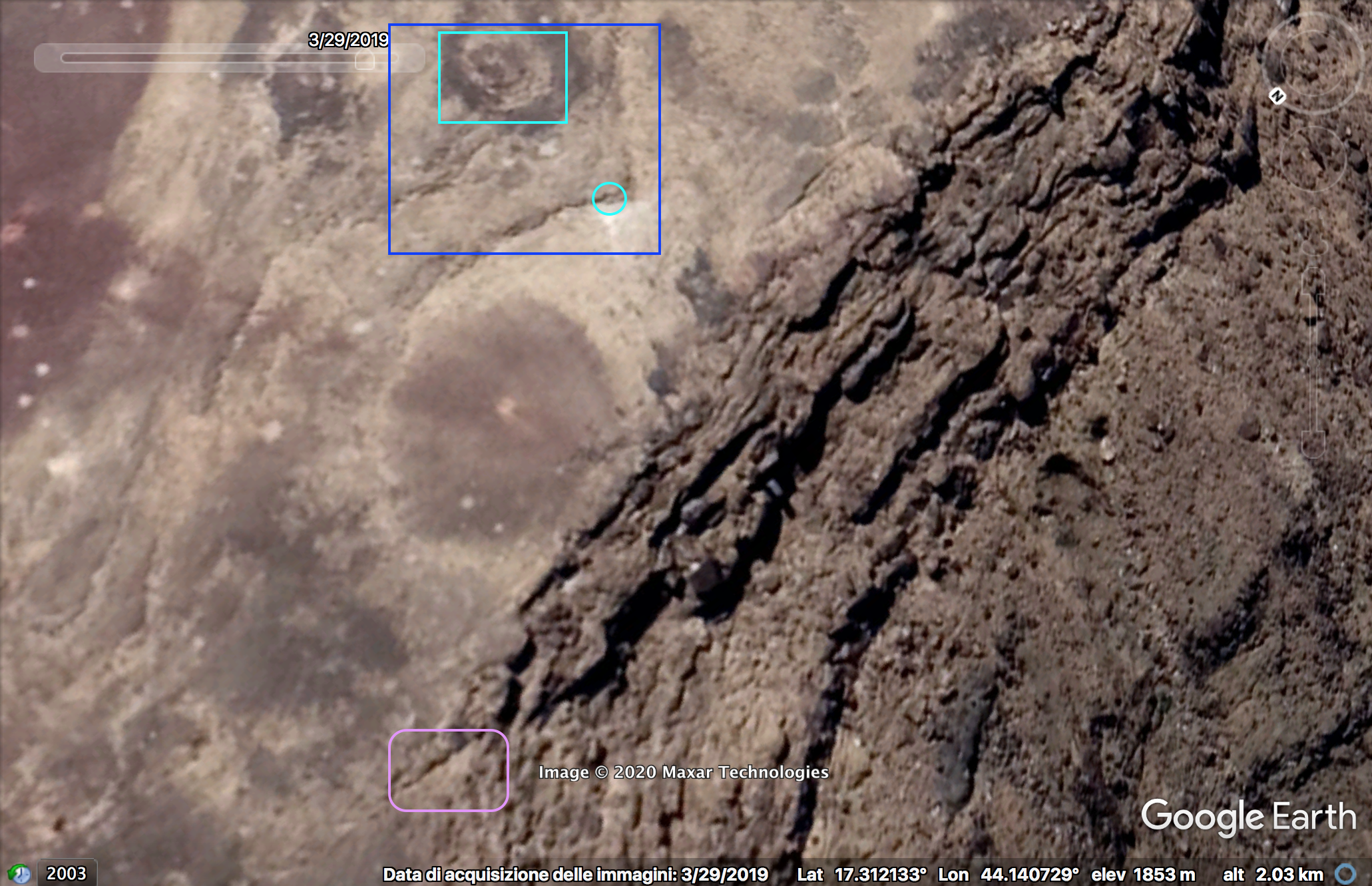 To further verify this location, two additional frames are used focusing on the left and right side of the initial image. At 32:33 – left side – three different patterns in the boulder ( blue, green, light blue) and two triplets of stones ( red and orange) are identified that can also be spotted by satellite. The squared stone (purple) is used as reference for the first image.
