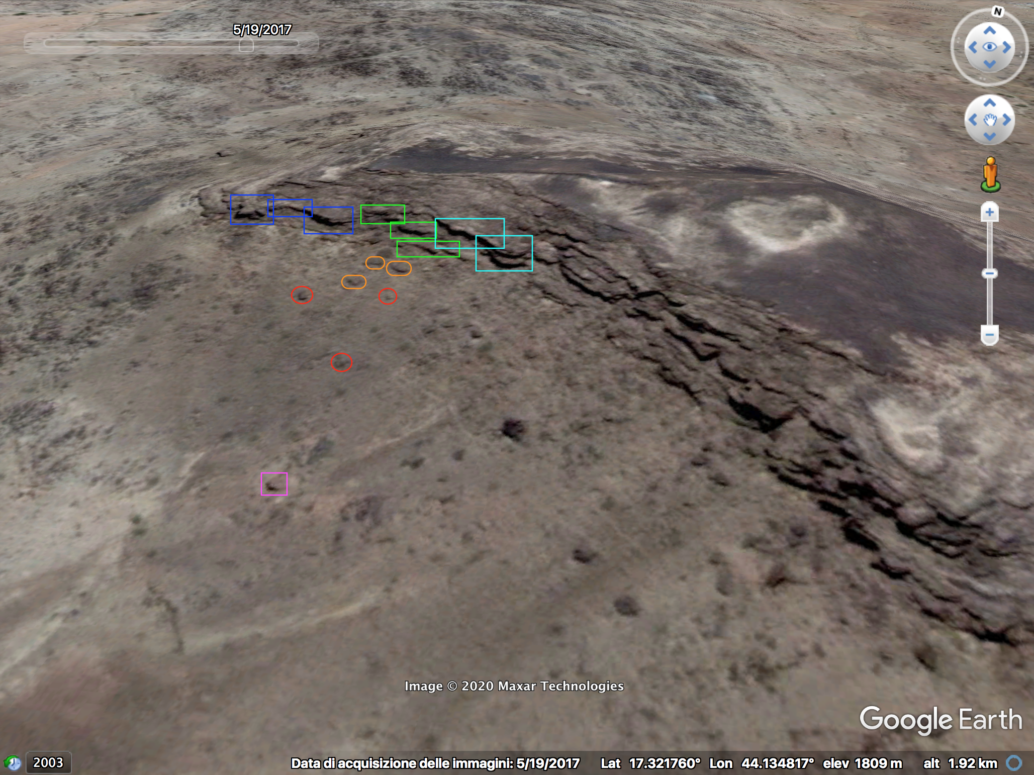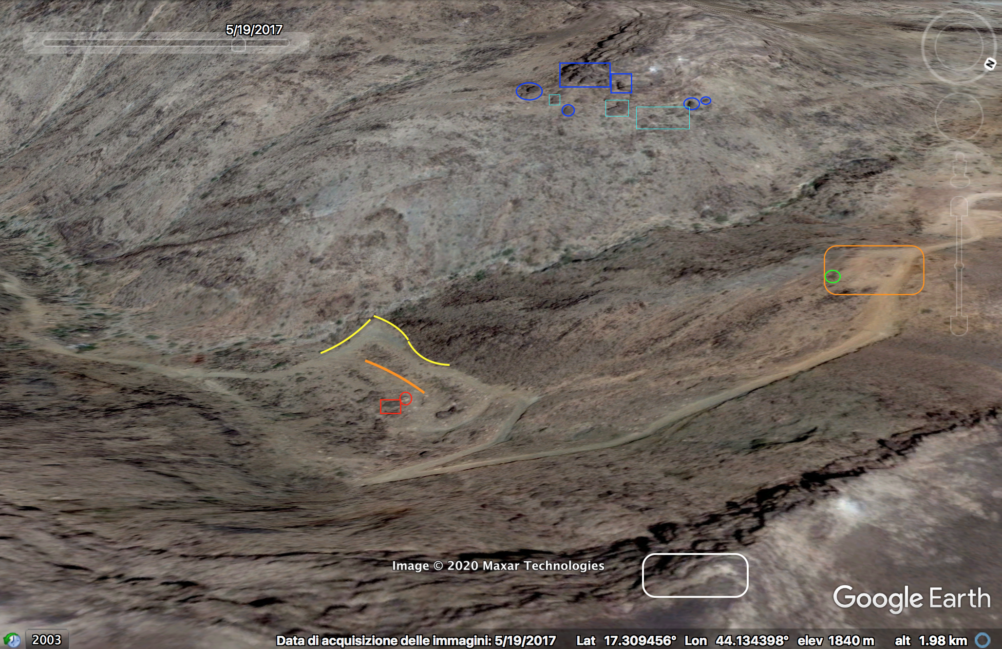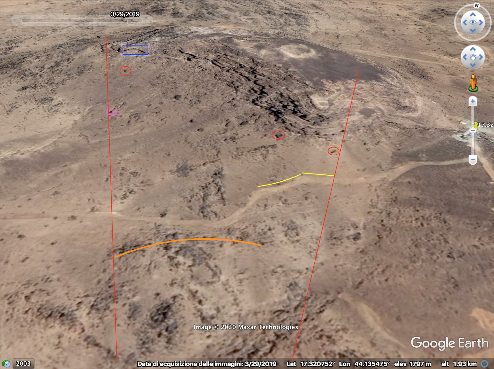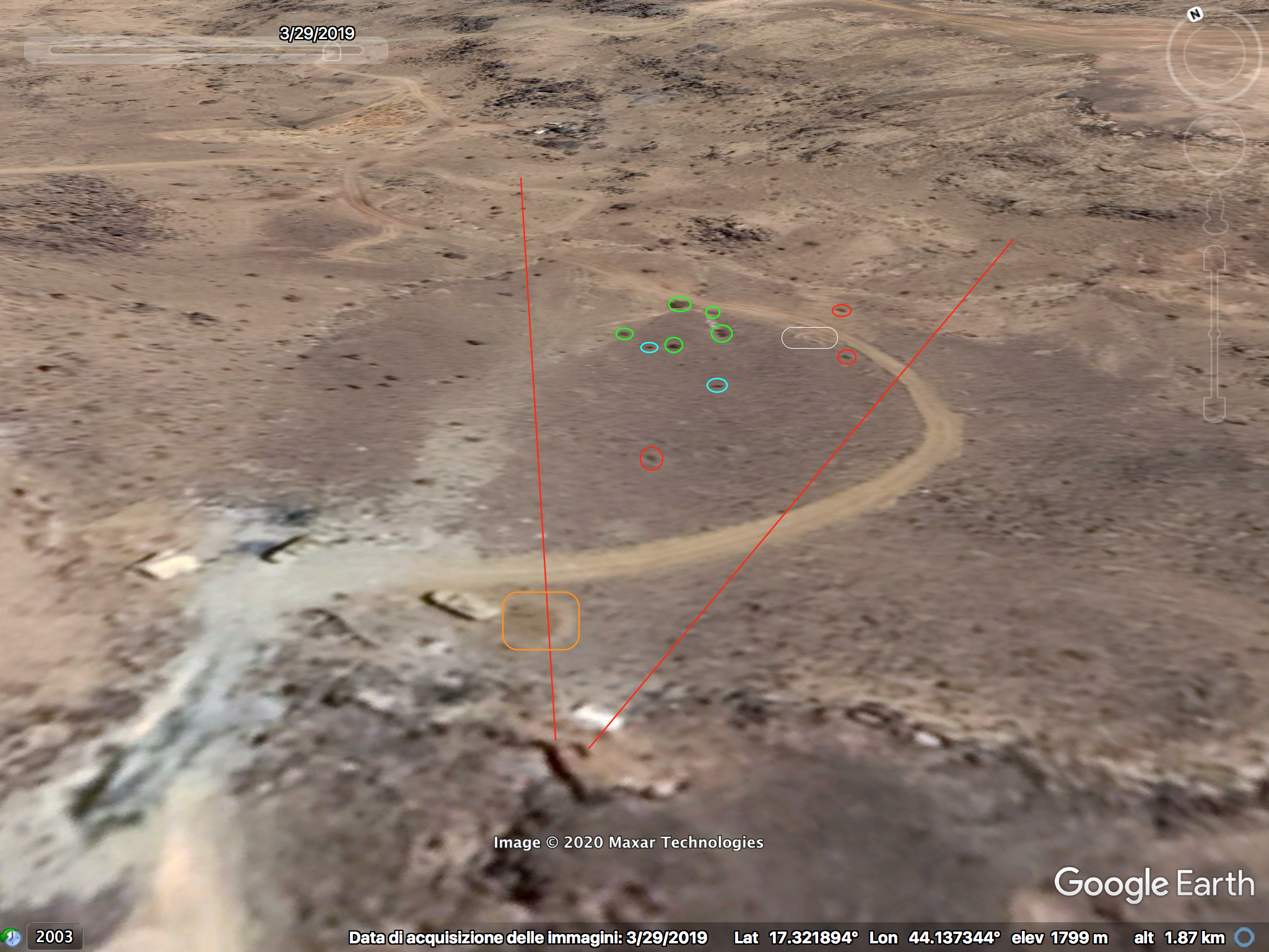 This perspective was likely recorded from the top of the left elevation of the area. At min 35:10 several elements have been identified to verify this location: two converging tracks (red), along the top track three whitish areas (yellow), two additional whitish spots (orange), a small slope next to the used cases (purple), a small boulder (blue) and a big landslide in the background (white).