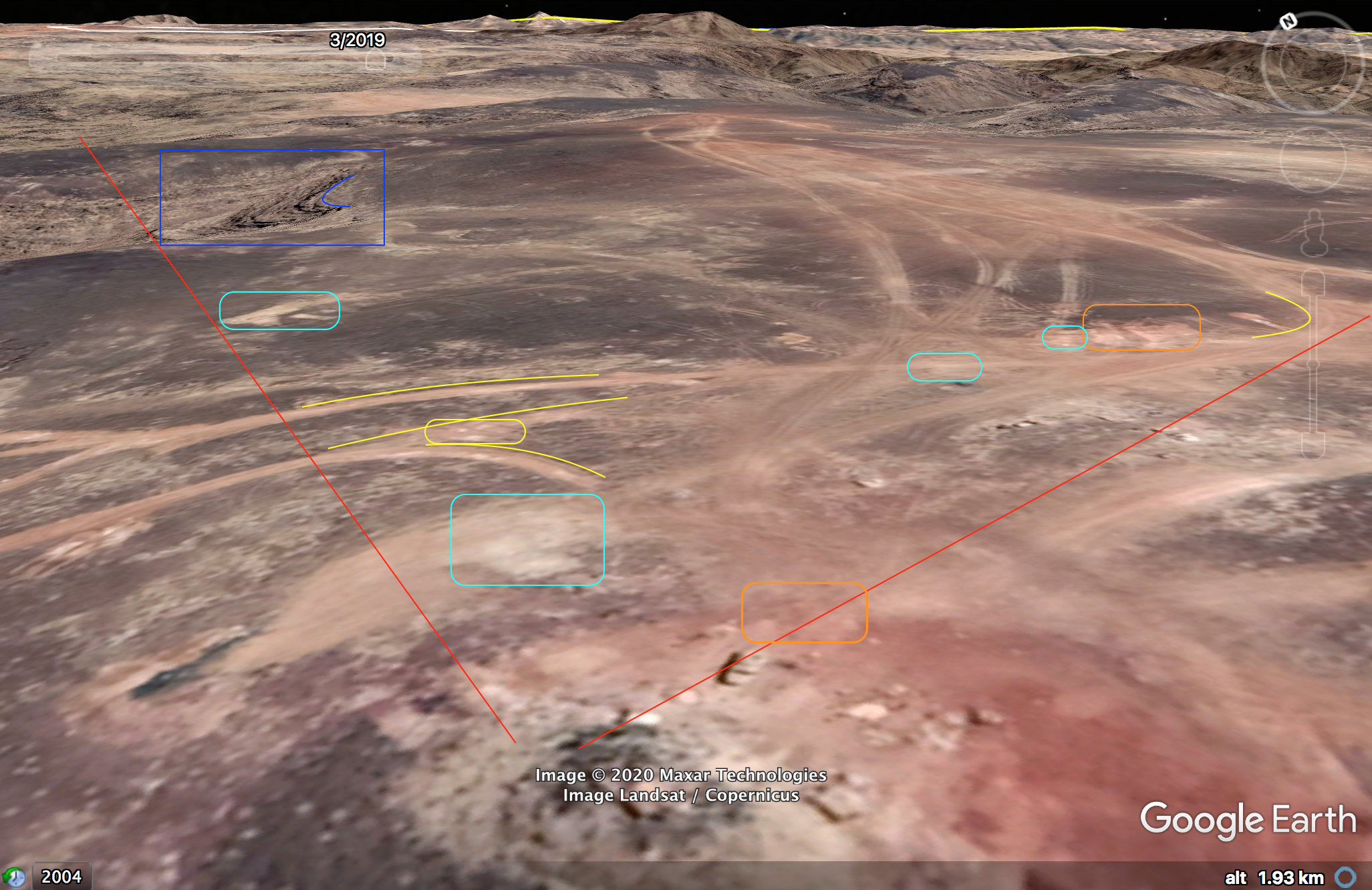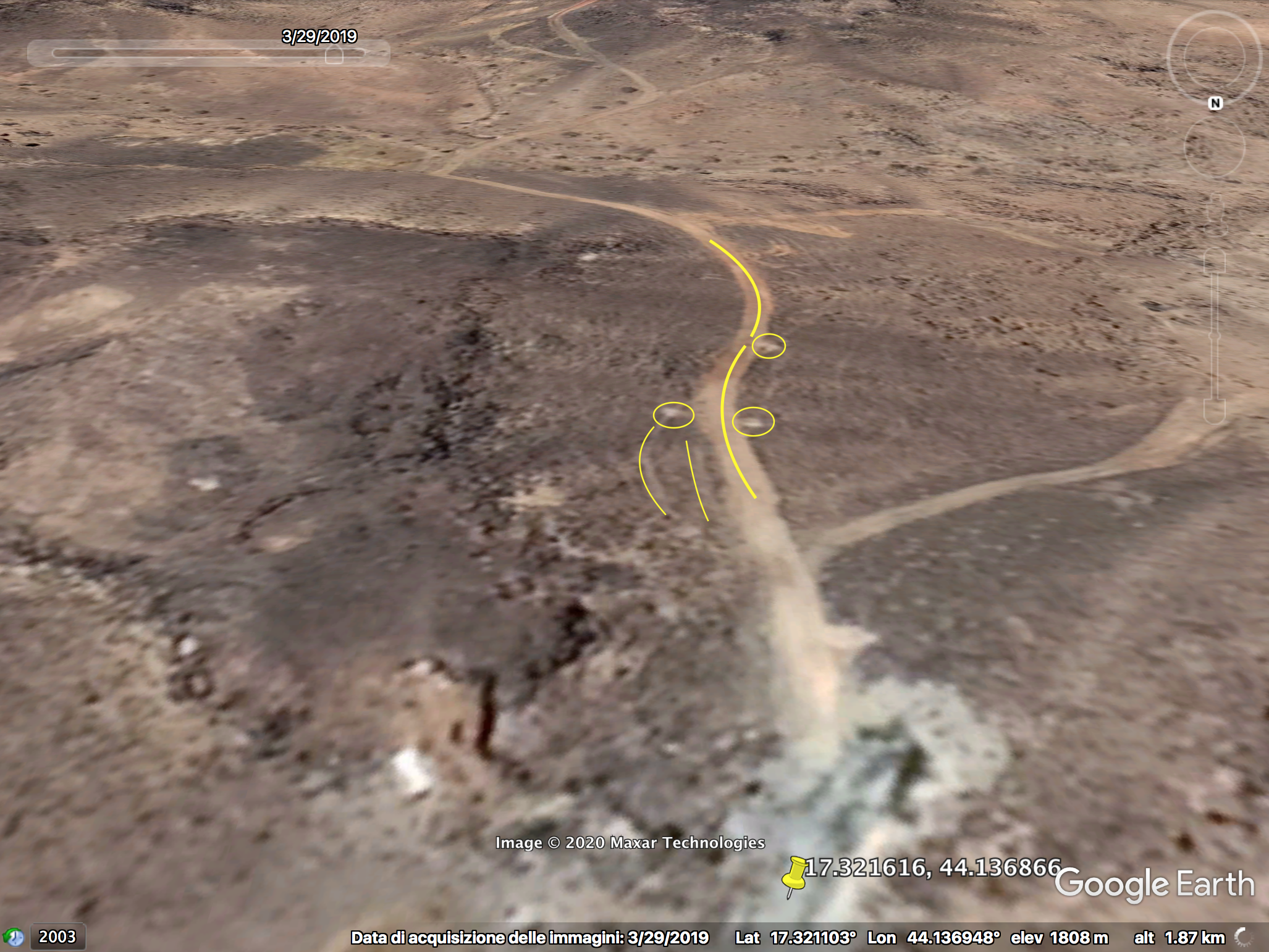 The last geolocation is a different perspective of the top track of Perspective D. At min 32:54 the cameraman is facing South; the track has the same disposition of whitish areas (yellow circles) and follows the same pattern: smooth curve to the right then smooth curve to the left (thick yellow). Additionally, two small marks (thin yellow) can be spotted by satellite in relation to the top whitish area indicated earlier.