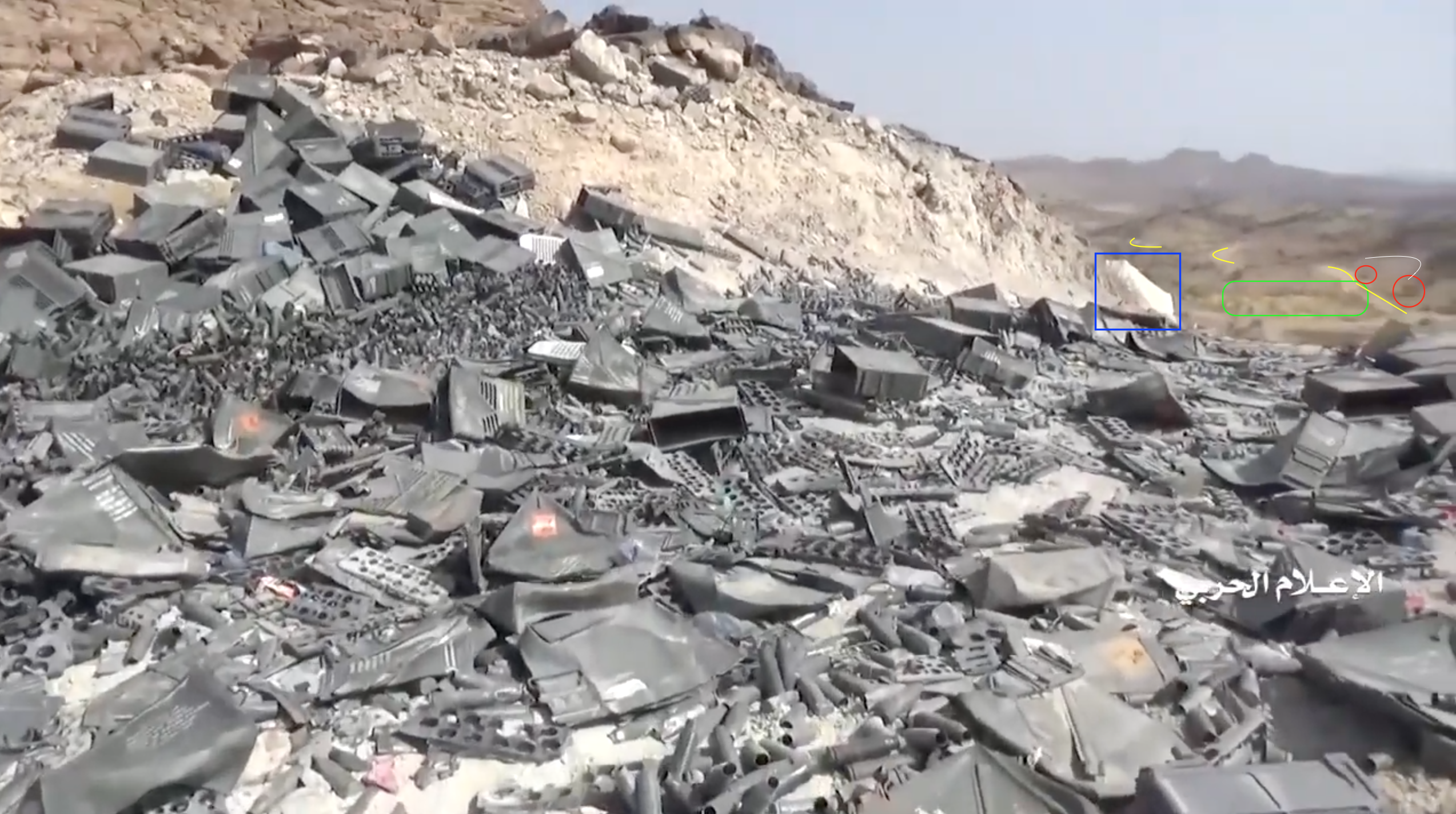 The frame at 32:51 of the video mainly shows the vast amount of expended Saudi cases, but some elements can be spotted on the top right corner: a white tent (blue) just behind the side of the hill, a track (yellow) far in the background going North with a greenish area (green) on the left of its initial portion and two rocks (red) on the right side. Additionally, on the right of the two rocks, a dark arch-like disposition of smaller rocks (white) can be spotted.