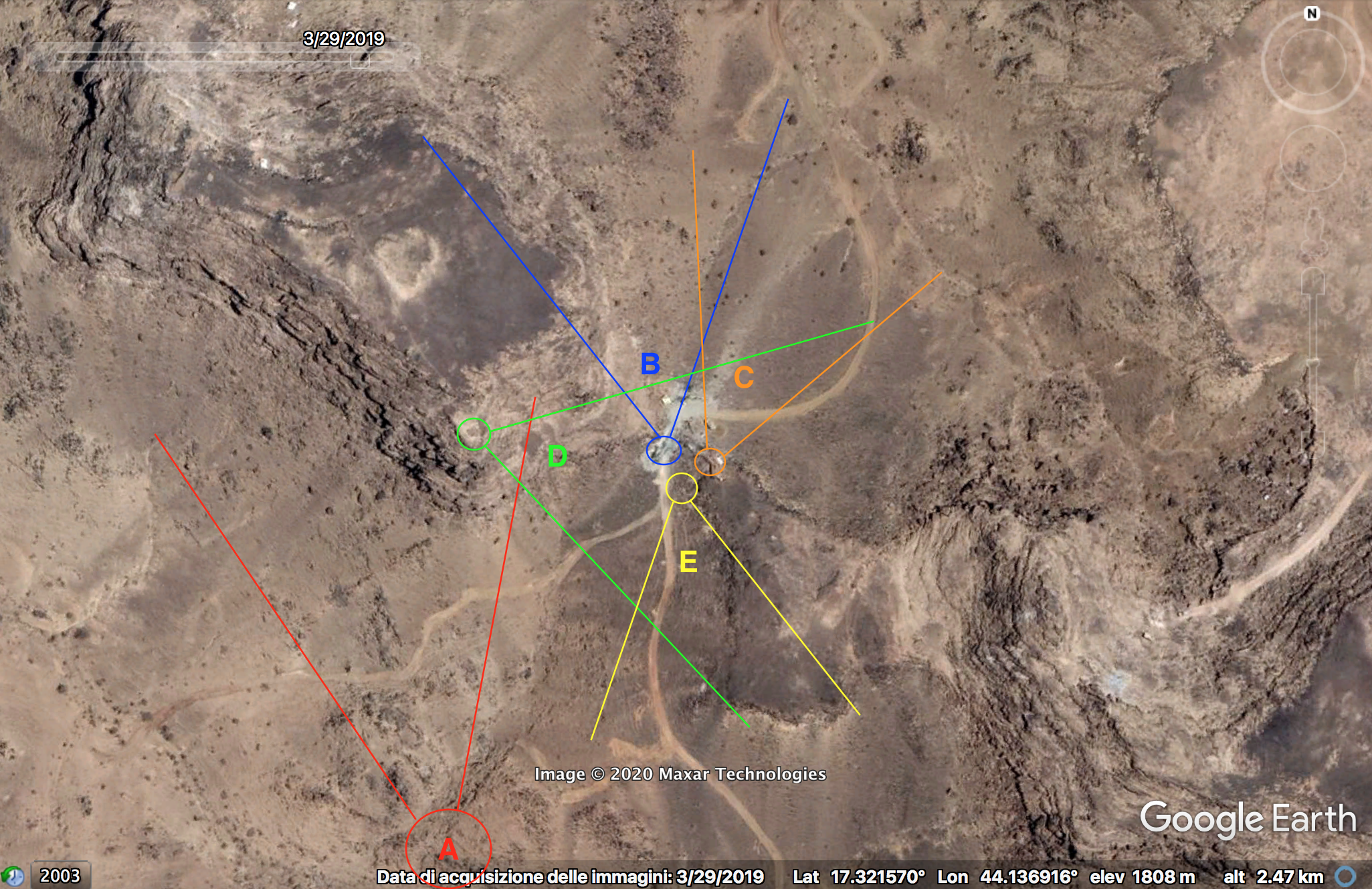 The video shows five different perspectives (A, B, C, D, E) recorded around the same area (the locations indicated are an approximation based on the perspectives in the video). The post rises on a pass between two elevations; on satellite footage (captured on 03/2019) it is possible to spot large military vehicles close by, indicating it was likely used as regular guardpost by the Saudis. The Yemeni footage confirms this assumption. It additionally shows a large quantity of expended cases of different calibers (B) and an ammunition storage (C) close by.