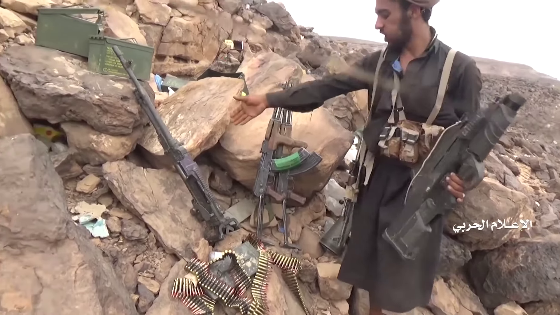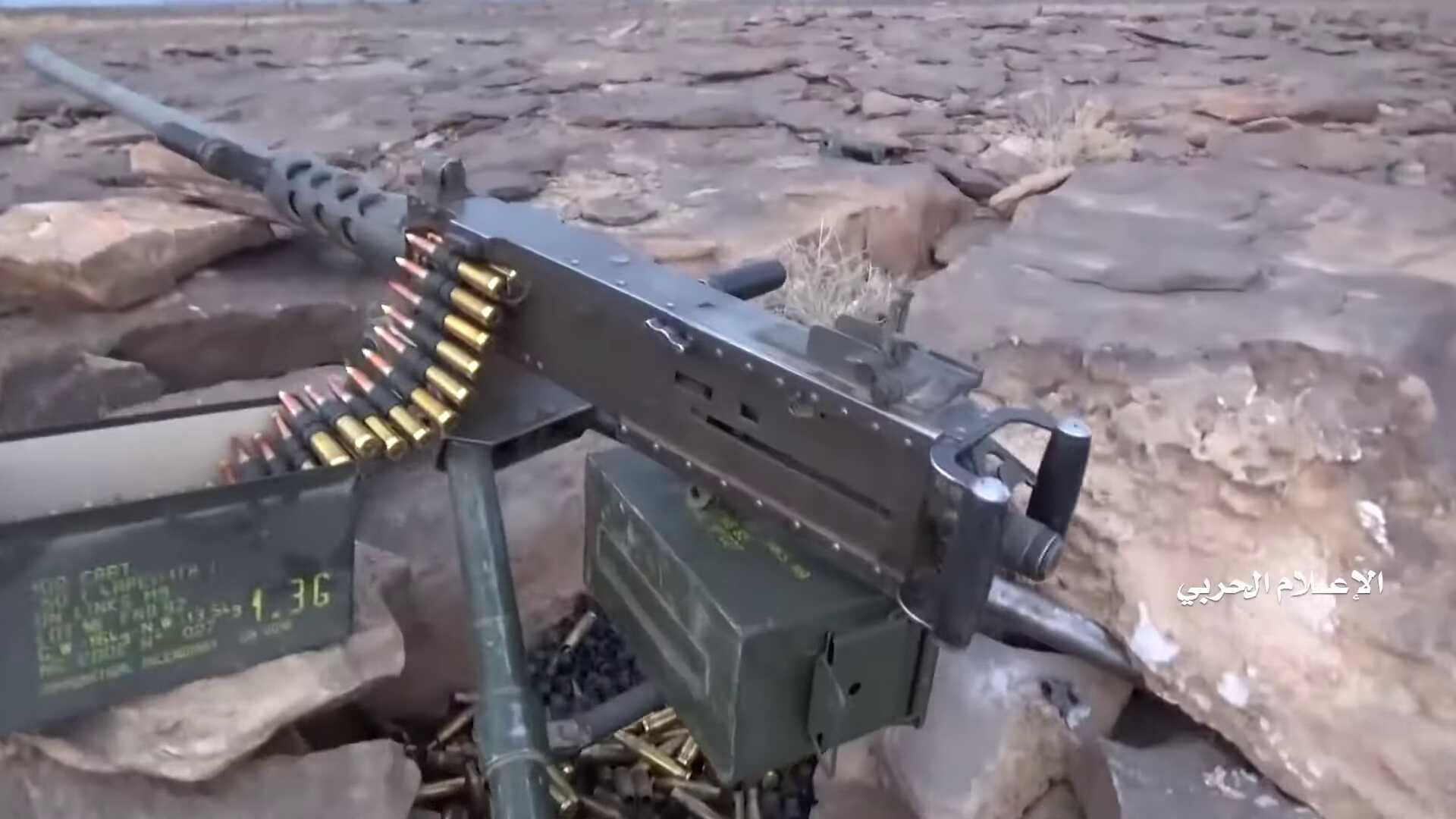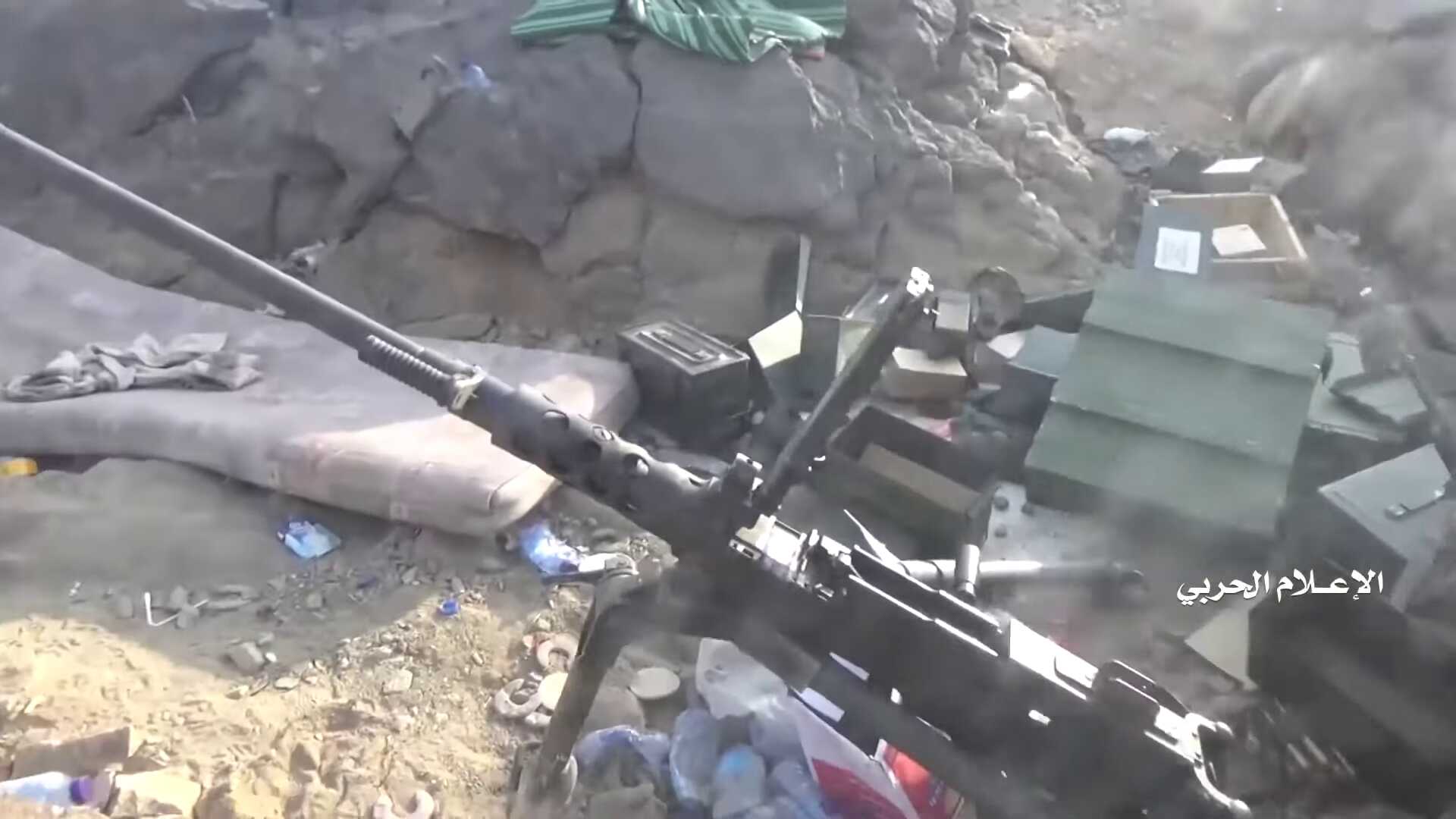 The video shows the presence of a FN-made M2HB machine gun at this position, and probably another one at the hilltop position. A similar M2HB is shown on 9:23-9:29 at another outpost (not geolocated, but probably at the south-east side of Alfare valley). These FN heavy machine guns, which also show up in later parts of the video are therefore standard equipment in these Saudi outposts.