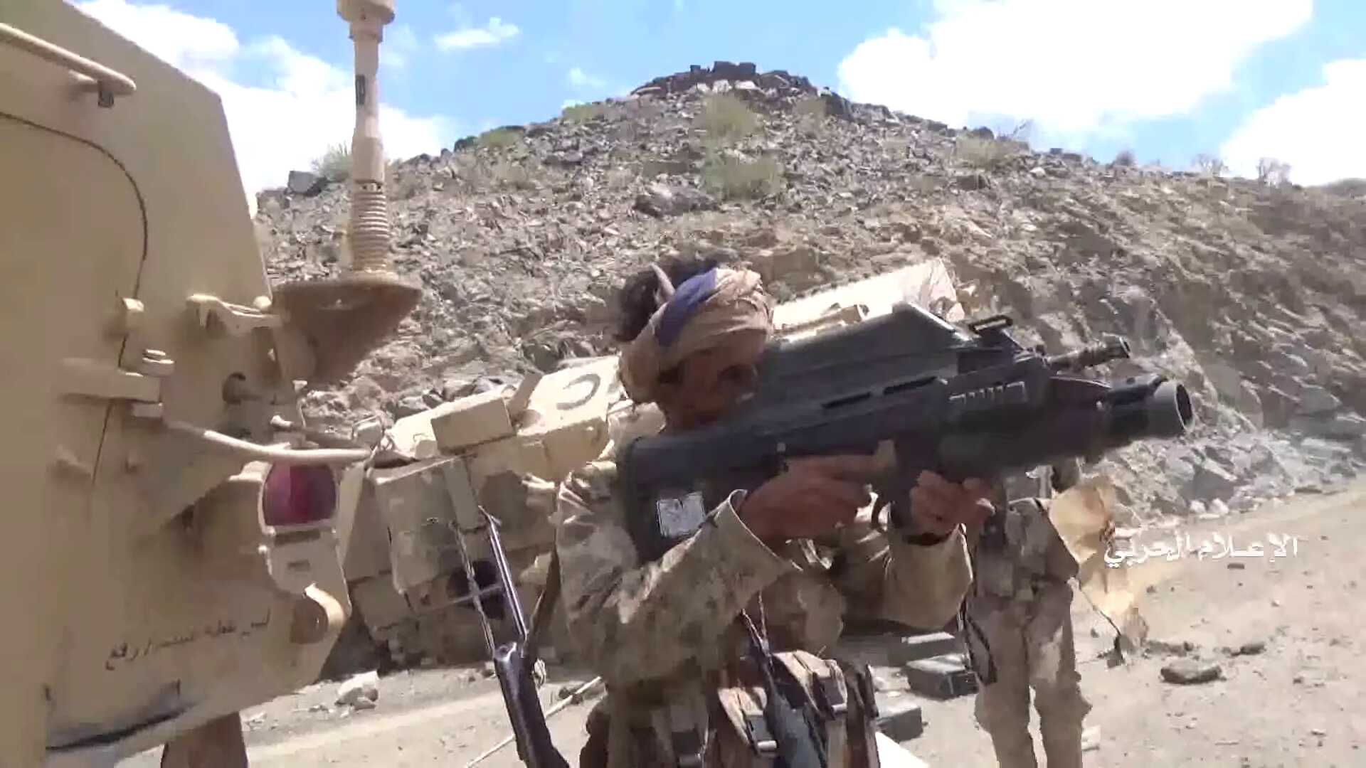Based on the footage released by the Houthi, these Yemeni fighters were equipped with military vehicles (Oshkosh M-ATV's, M113's, ... —all with markings referring to the Saudi armed forces) and Toyota pickups. In this phase we cannot detect a direct involvement on the ground of the Saudi National Guard, although there is Saudi involvement through air strikes (visible on some of the images of the surrendering fighters). Therefore we did not put extensive effort in geolocating this footage. Also, the reporting from both the Yemeni fighters participating in the advance and the Houthi about the events seem to corroborate.