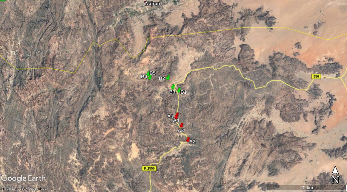 The first part of the Houthi-made video, from 0:42 to 6:24, shows the final attacks on the retreating Saudi National Guard forces coming from the Jabara valley and the take-over of the Saudi outpost and positions near the entrance of the Alfare valley on the road 1556. First we see the LAVs and other vehicles passing, and attacks on them and the position, from viewpoints situated south. Later we see images at the conquered outpost itself from several angles and positions. After this fragment images are shown of tents and mortars in the small valley behind this outpost and before the last hills in front of the Alfare valley (7:05 – 8:05), but we focus in the geolocation on the outpost.